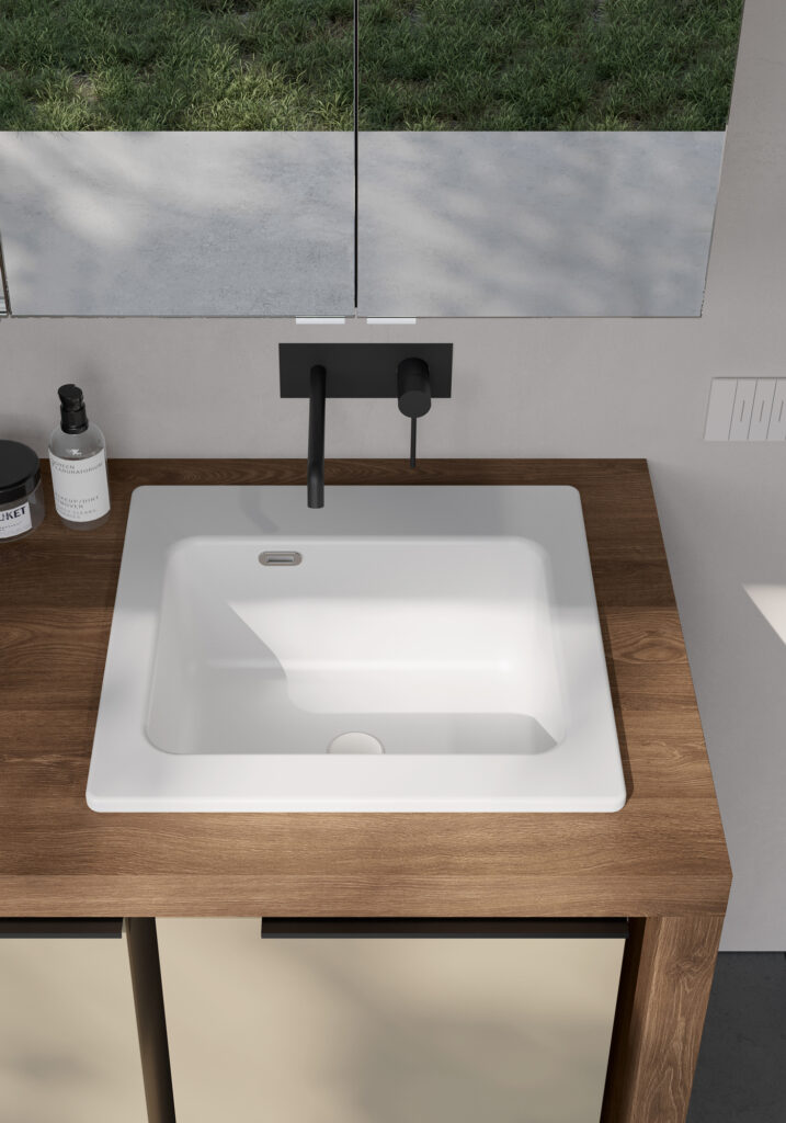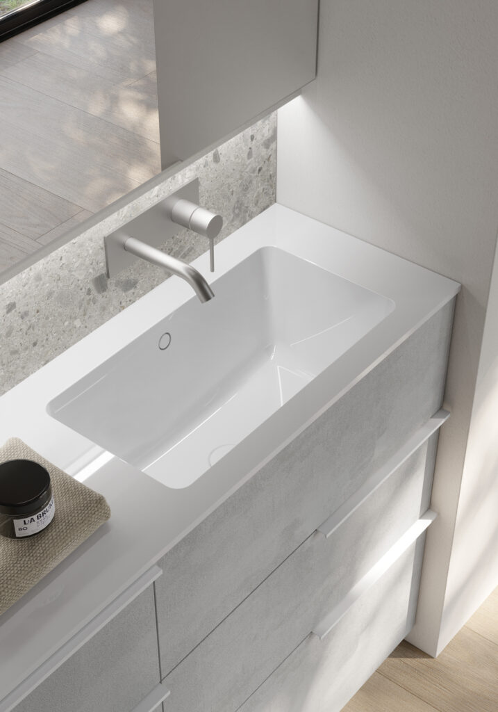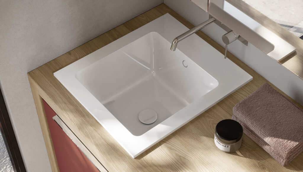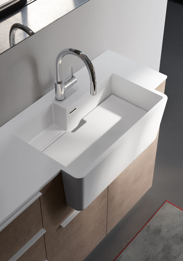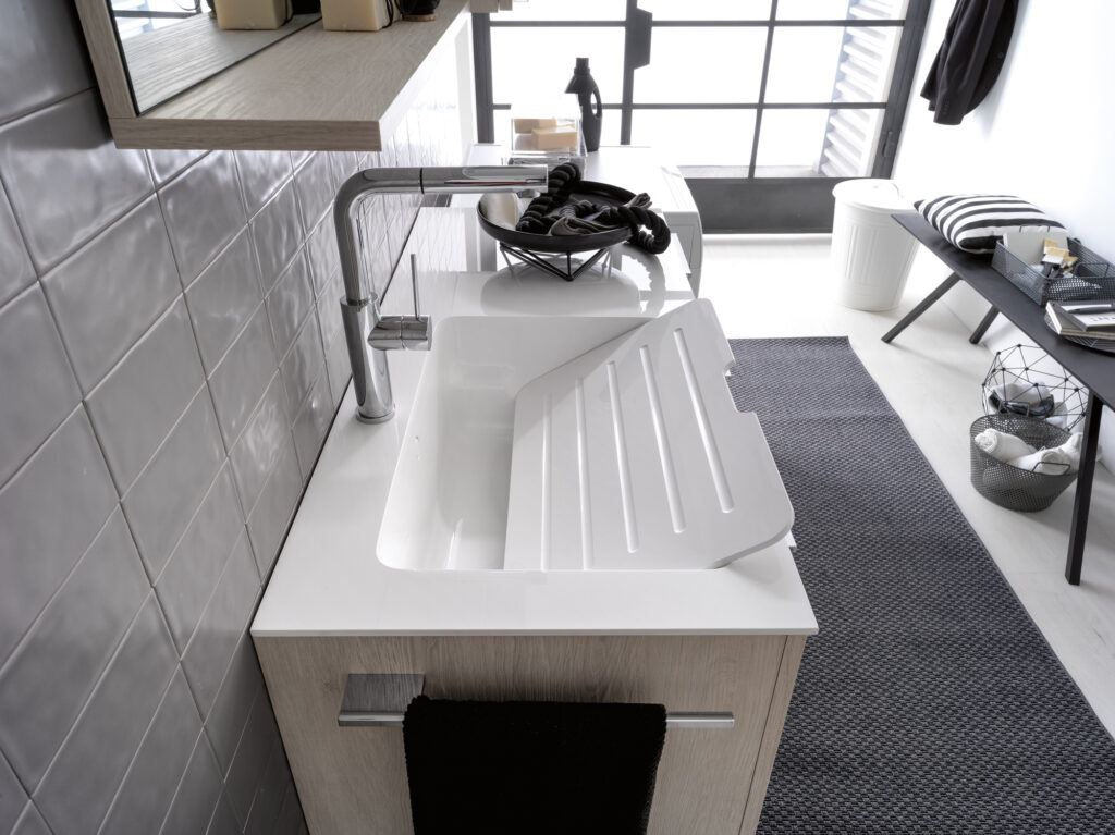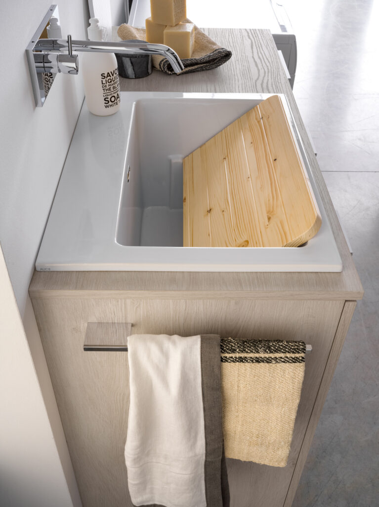 Quando il bagno viene usato principalmente come tale e saltuariamente come lavanderia si può optare per un lavabo che diventa lavatoio solo all’occorrenza. In questo tipo di modelli la profondità della vasca è standard ma la tavoletta può essere facilmente rimossa per scoprire la reale profondità del lavatoio. Disponibile sia in versione integrata nel top che da semincasso, questo lavatoio ibrido potremmo definirlo a scomparsa per la sua capacità di mimetizzarsi elegantemente nell’arredo.