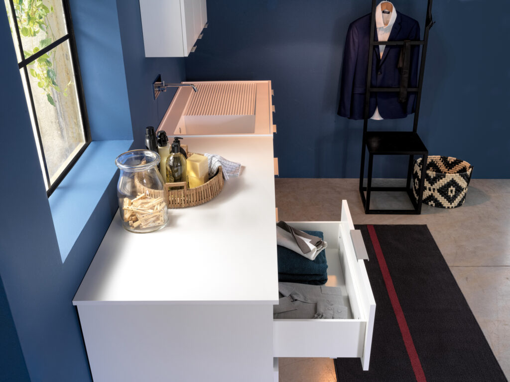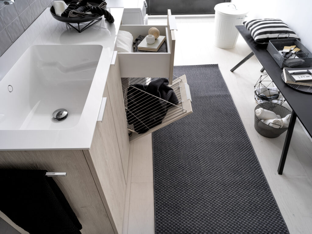 Pratico per la pulizia e esteticamente lineare, capace di adattarsi a qualsiasi stile d’arredo e perfetto in uno spazio lavanderia integrato in un bagno che non sia esclusivamente di servizio.