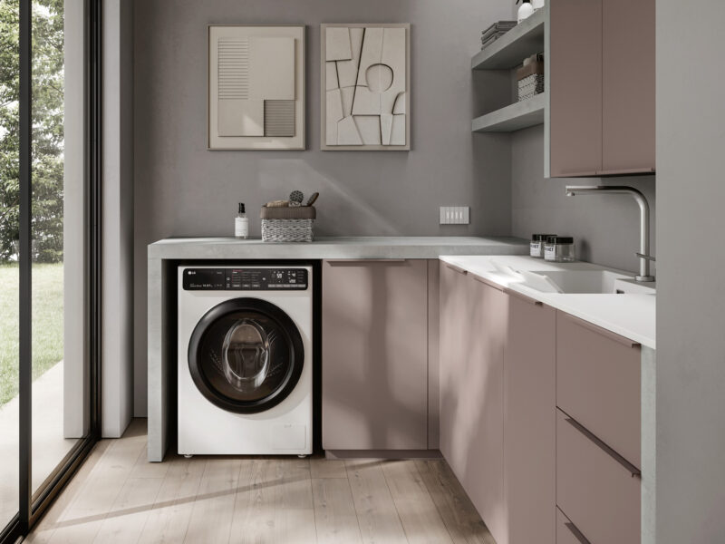 Pratico per la pulizia e esteticamente lineare, capace di adattarsi a qualsiasi stile d’arredo e perfetto in uno spazio lavanderia integrato in un bagno che non sia esclusivamente di servizio.