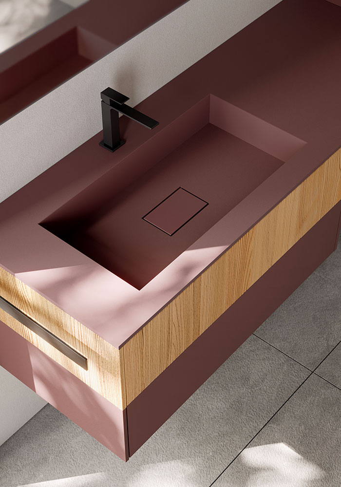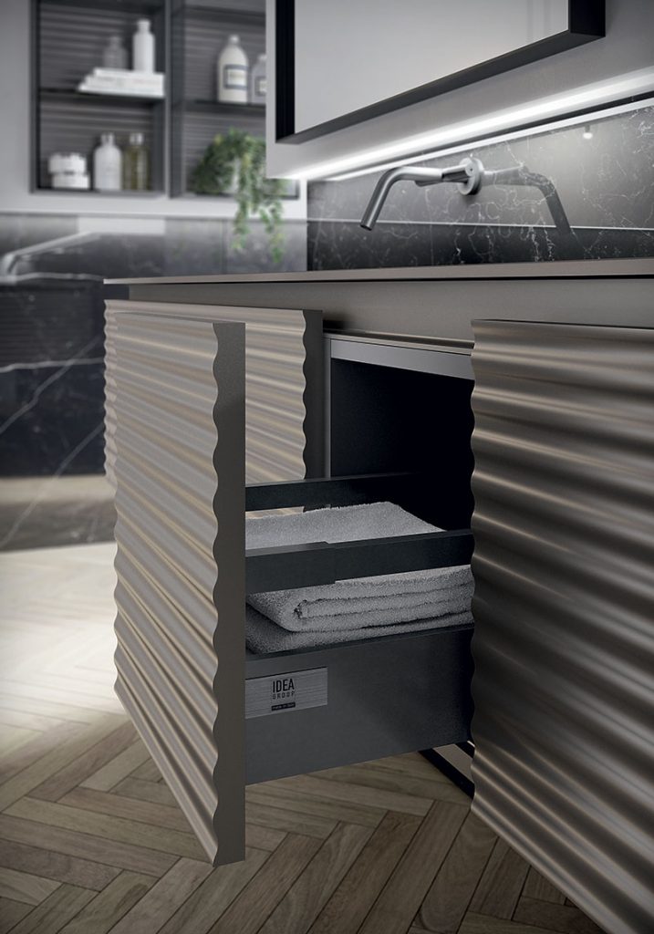 Quest’ultimo, esposto in gres effetto pietra piasentina, aggiunge al ventaglio di possibilità progettuali Ideagroup la possibilità di coordinare top dei mobili, piatti e scaldasalviette.