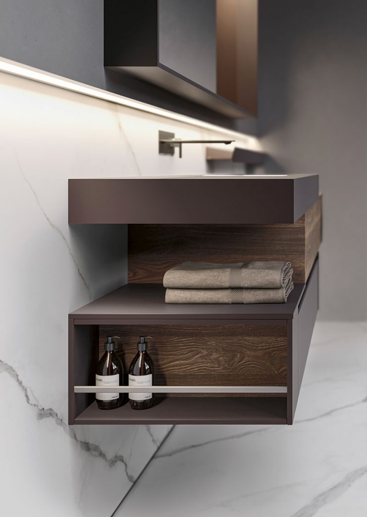 Anche Nyù ha subìto un notevole restyling, che dona alla collezione ancor maggiore funzionalità e più opzioni compositive. Originali frontali a giorno che duplicano lo spazio contenitivo, nuovi top in gres e in HPL con lavabo integrato in mineralsolid a filo bordo e una gamma finiture sempre più ricca che ingloba nuove finiture in HPL effetto legno, oggi sempre più realistiche ed eleganti, e 12 colorazioni di laminato Fenix NTM.