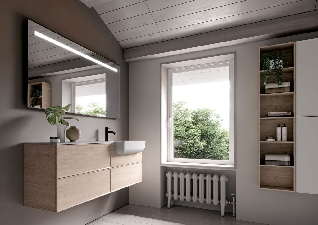 Non è necessario scegliere: laccati e legni si possono combinare dando vita a composizioni di arredo bagno originali e dal look trendy. La possibilità di combinare vani a giorno e vani chiusi permette inoltre di creare giochi di pieni e vuoti esaltati dal mix di finiture e colori. Nessun bagno sarà uguale all’altro.