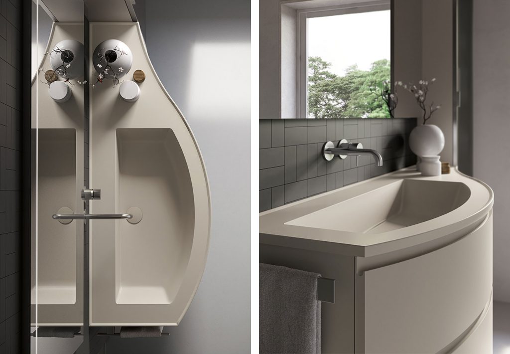 Per gli amanti delle linee curve Form propone la base stondata, affiancabile sia alle basi squadrate sia a un fianco curvato terminale. Sulla base portalavabo si può installare un elegante lavabo in mineralsolid con bordo contenitivo perimetrale antigoccia, disponibile anche nella stessa colorazione del mobile: una finezza progettuale unica per una collezione di arredo bagno.