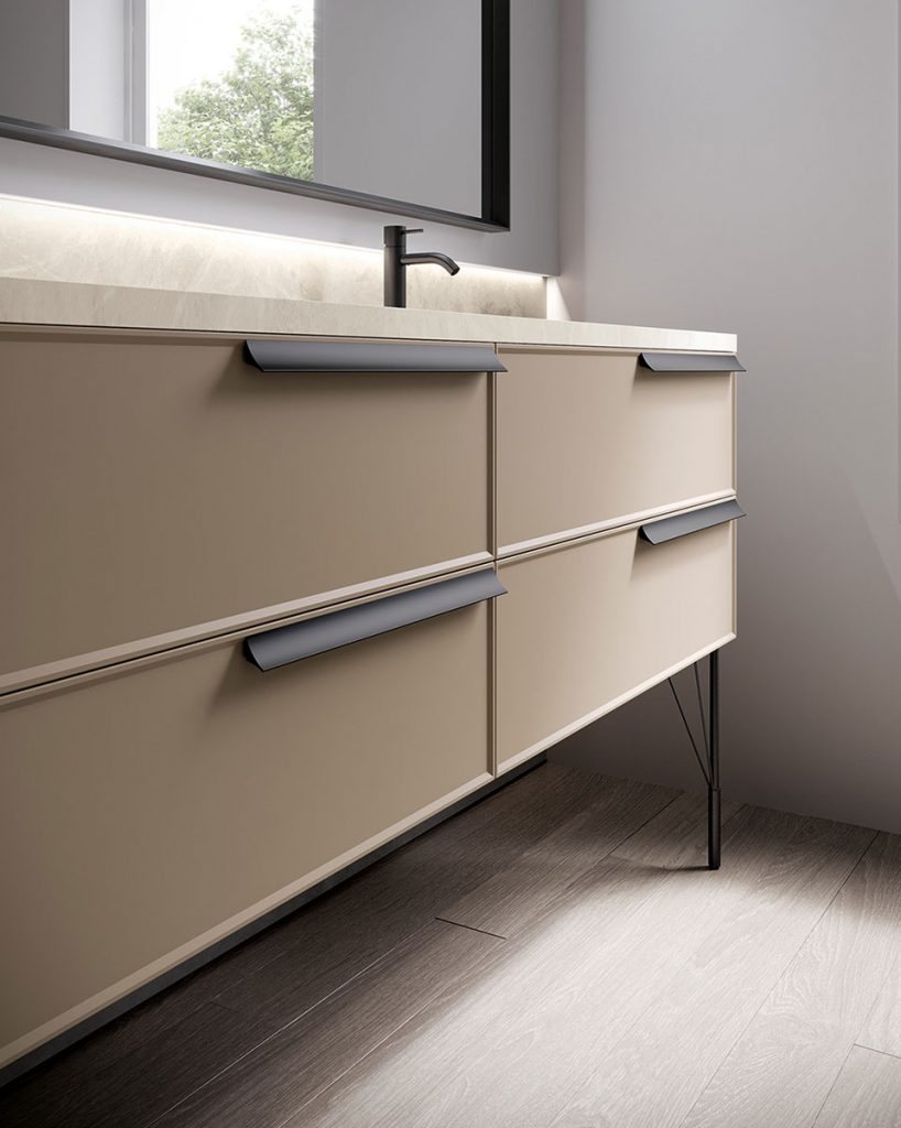 Anche in questo caso Form non delude. Ante e cassetti sono disponibili con o senza maniglia, accessorio che è possibile poi coordinare con i profili delle specchiere o con i piedini in alluminio per un’armonia stilistica impeccabile.