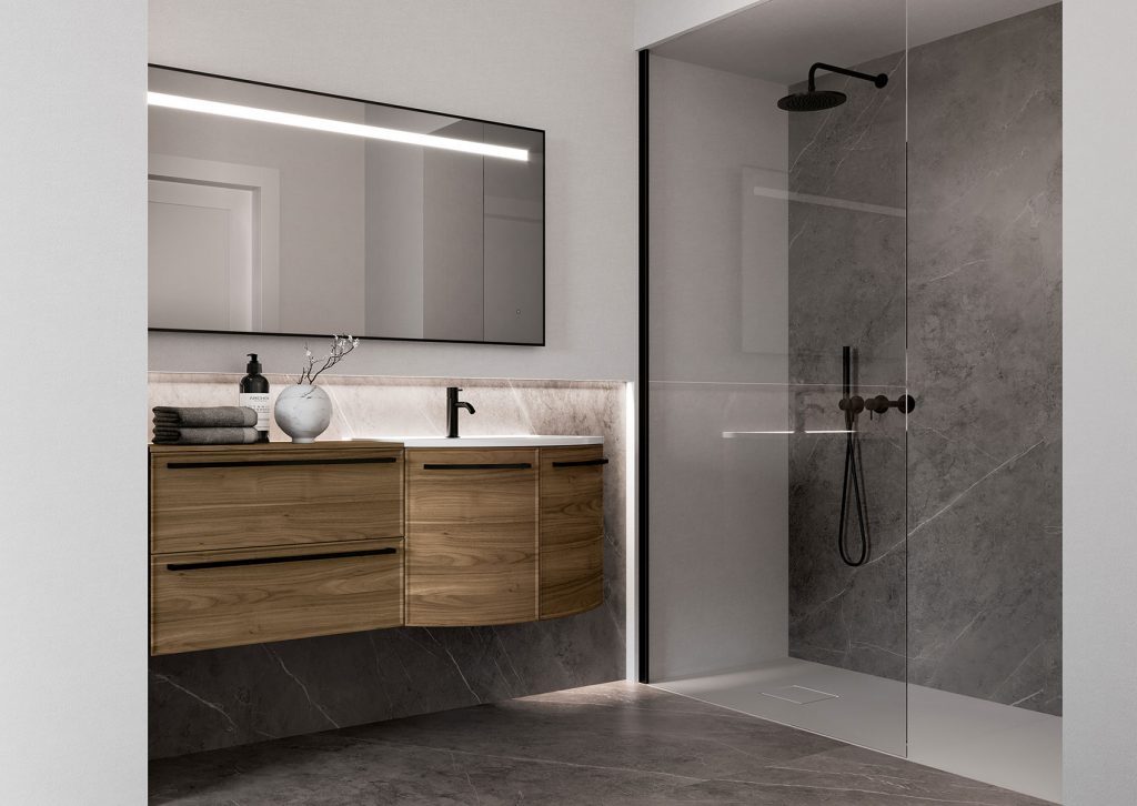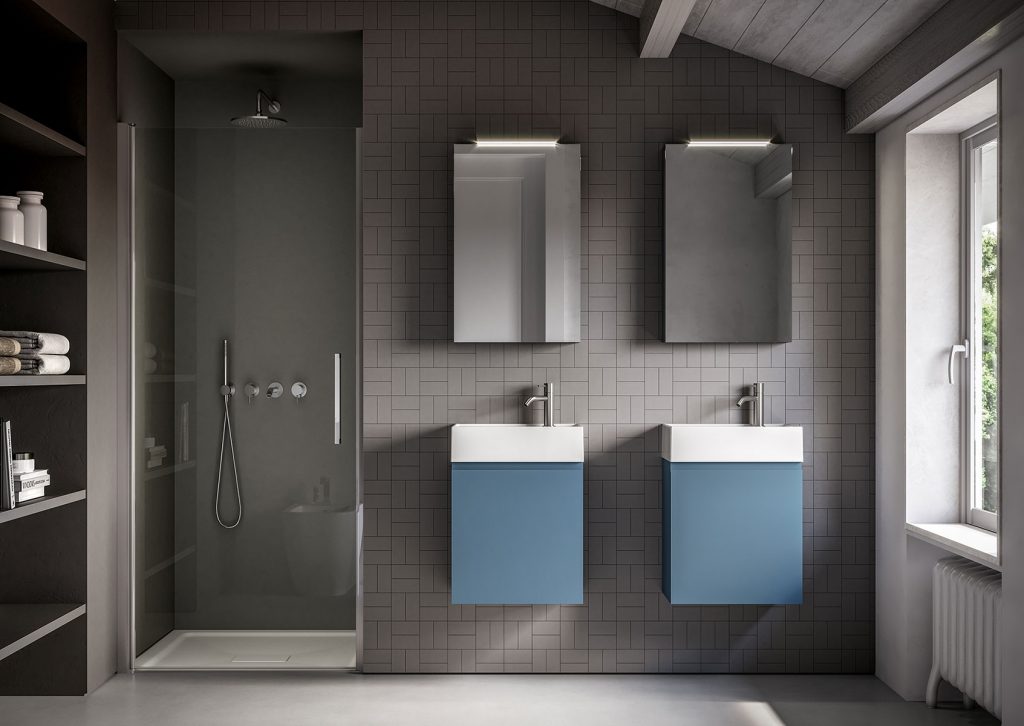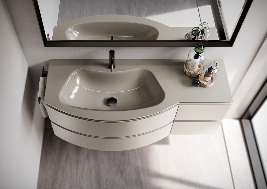 Questo si traduce nella possibilità di creare un monoblocco cromatico estremamente elegante, in tutte le colorazioni disponibili a catalogo (ben 40), per un look tono su tono da completare coordinando accessori e piastrelle. E l’abbinamento non è possibile solo grazie al lavabo in mineralsolid: sulla base stondata, infatti, può anche essere installato un raffinato top in vetro verniciato in tinta uguale al mobile. Una varietà di soluzioni straordinaria per una collezione entry level, in grado di soddisfare qualsiasi necessità e gusto.