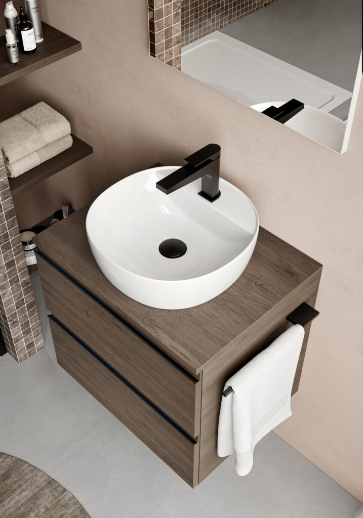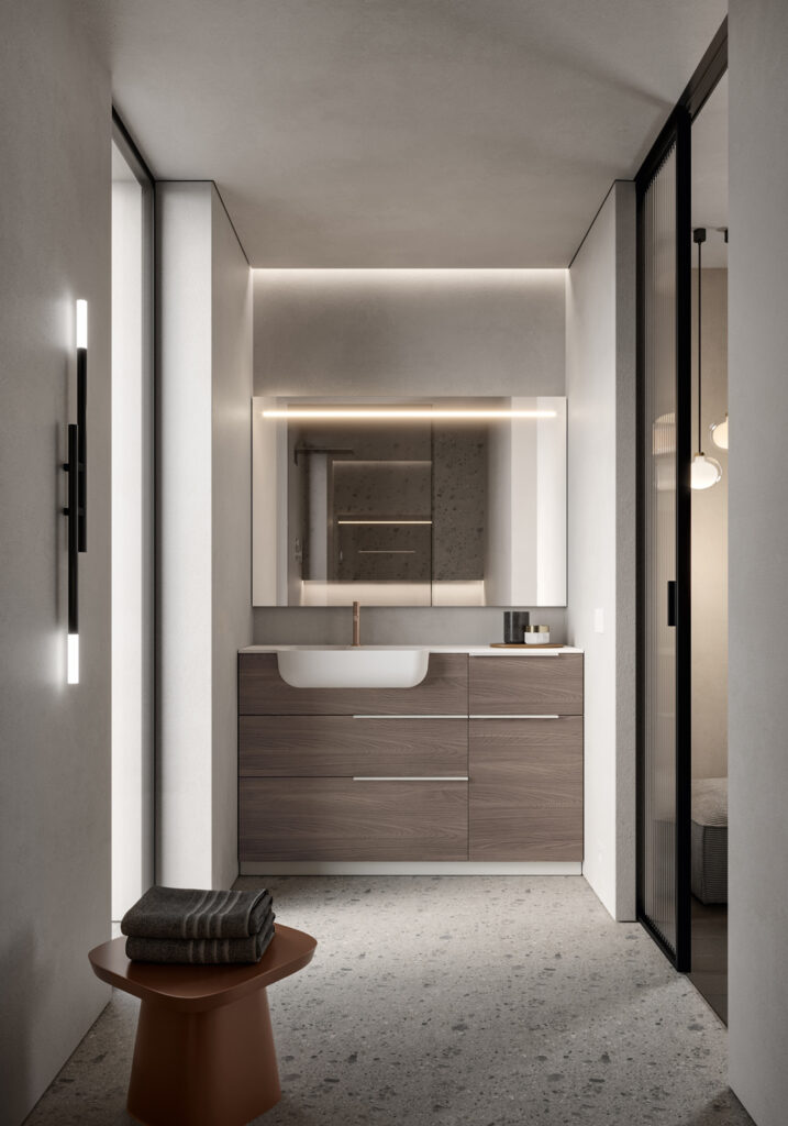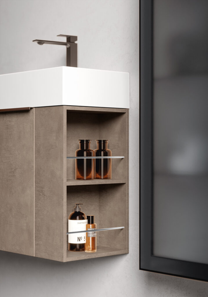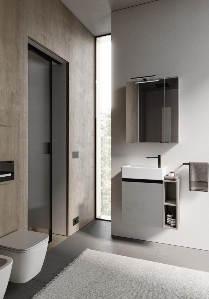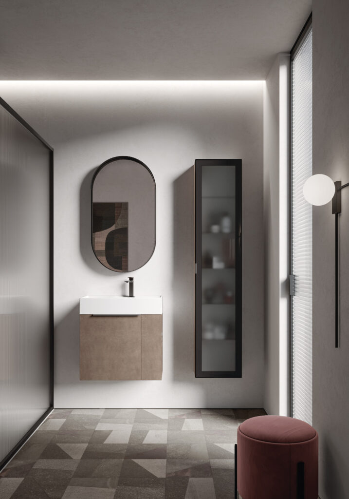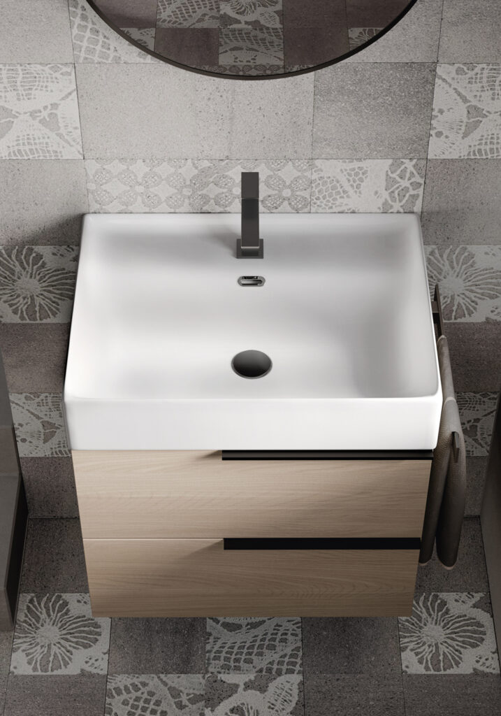 If the bathroom can accommodate a slightly larger vanity unit (still within the 60/70 cm width range), options widen to include floor-standing solutions, for example, which usually feature an additional deep drawer. If possible, depths become more generous, providing for useful interior storage space for organising bathroom essentials.