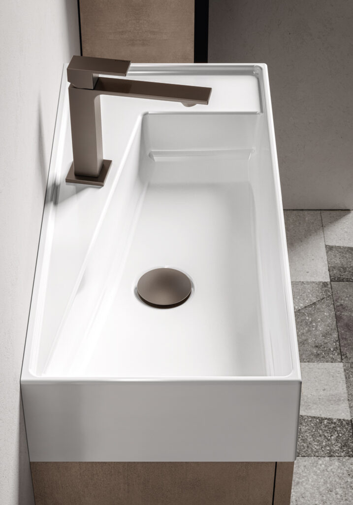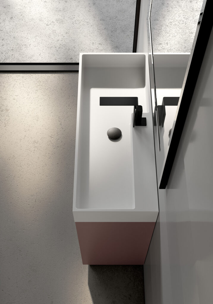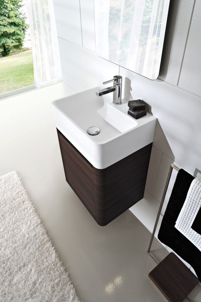When depth is the major constraint, it is necessary to find furnishing suites that have really compact dimensions but are designed in such a way as to offer some counter space and, if possible, also include a small closed storage space. Cloakroom washbasin is the term used for washbasins with a shallow depth (less than 36 cm): find below some examples from our collections.