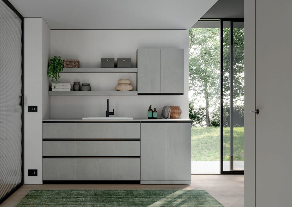 If the bathroom contains a laundry area you have to take into account not only the depth of the washing machine but also the fact that the cabinet that will possibly hold it is usually even deeper. If the bathroom is wide enough, a launderette may be created right at the entrance of the bathroom, separated by a dividing wall or storage closet. Alternatively, the washing machine can be integrated into the bathroom cabinet with the appropriate module, either on the long or the short side. The rear wall can be ideal for placing very deep furniture (in this case, a bathtub or shower can be placed in the bathroom entrance).