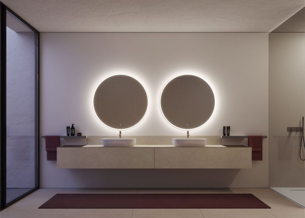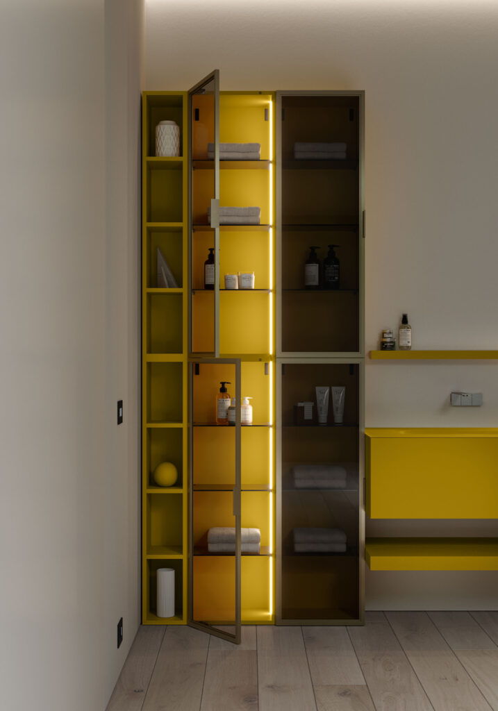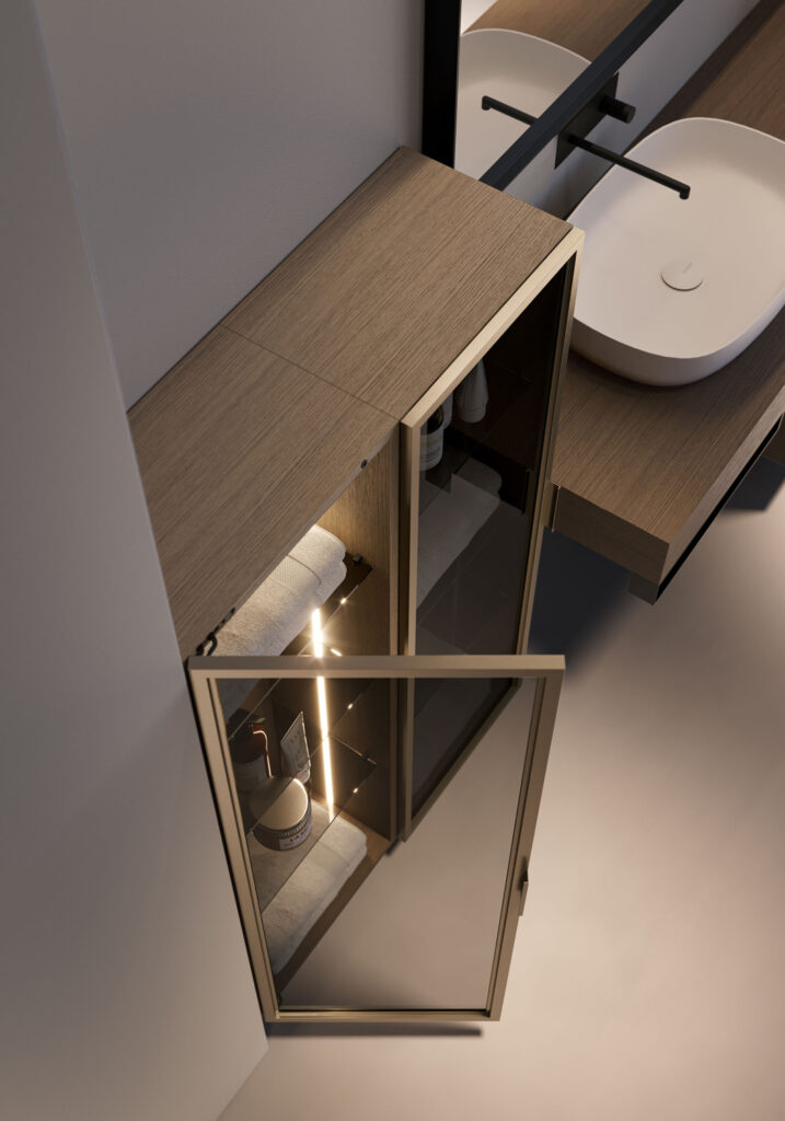 Un’ultima novità è rappresentata dall’aggiunta a catalogo di elementi contenitivi con anta in Cristallo finitura Fumé e telaio in finitura Bronzo con maniglia integrata, con illuminazione interna a led disponibile su richiesta. Questi nuovi moduli consentono di comporre l’arredo bagno in modo ancora più libero e originale variando altezze e profondità nell’ottica di una maggiore leggerezza compositiva.