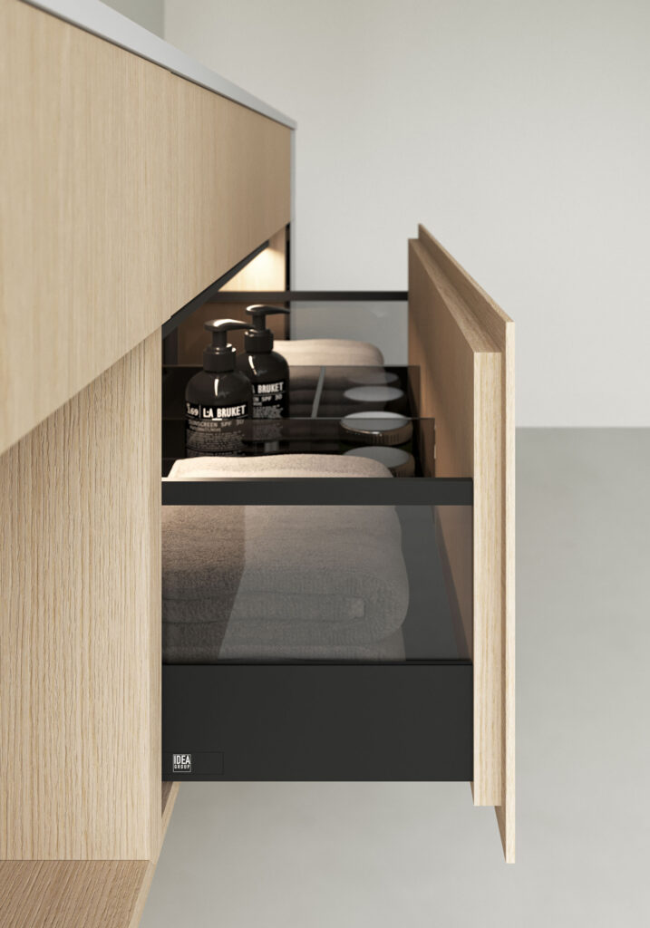 La differenza di altezza tra il frontale dell’anta e il top della base crea un comodo ripiano d’appoggio per cosmetici e oggetti personali.