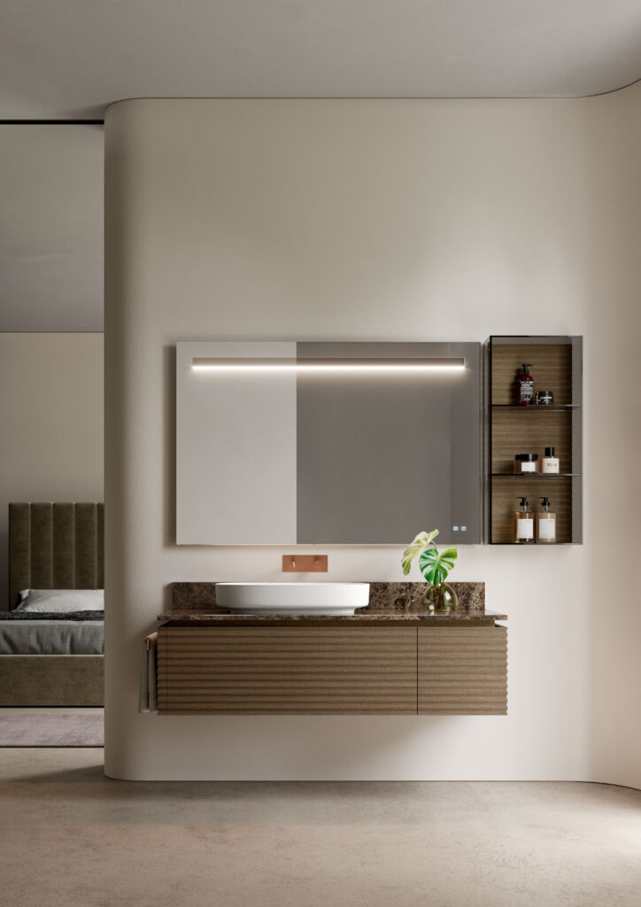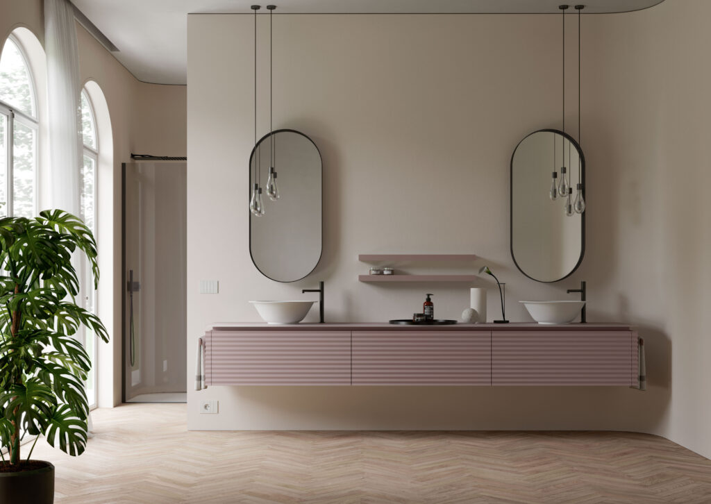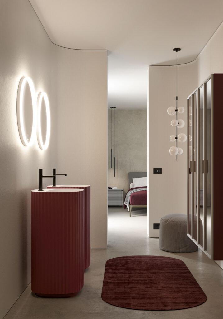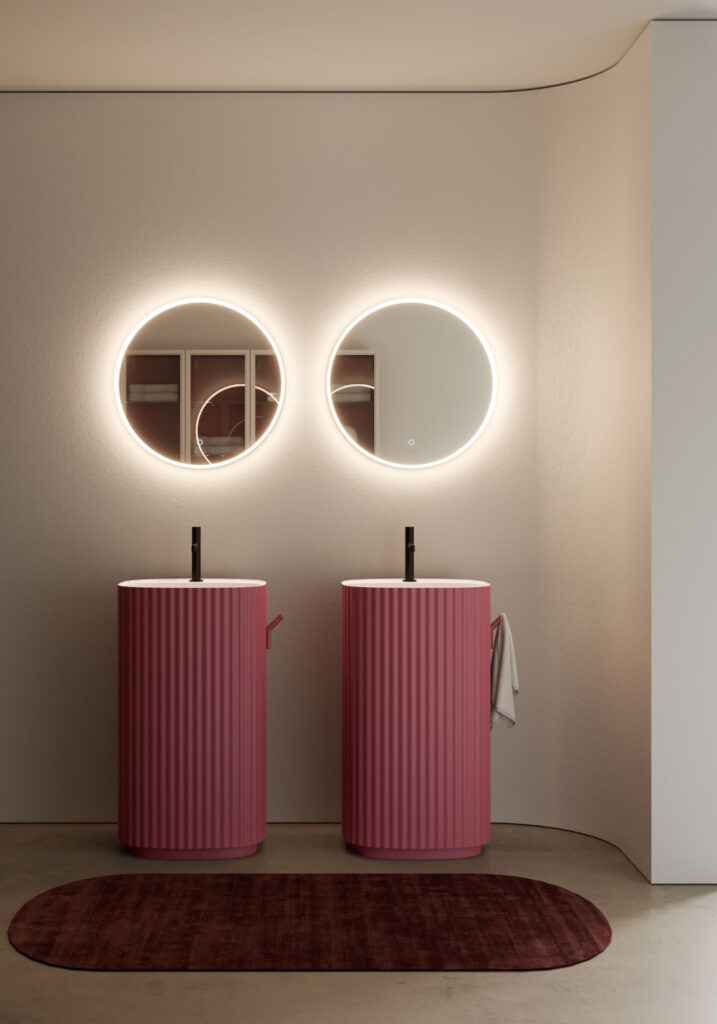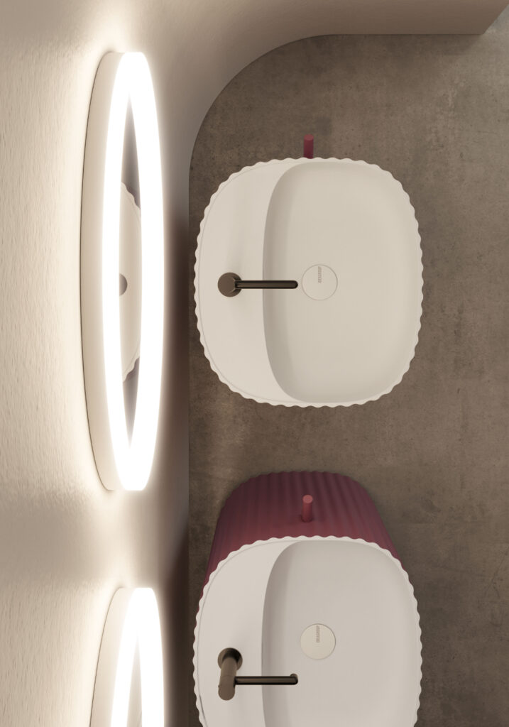 Ancora onde anche sulla superficie dei lavabi: entrano nella gamma i freestanding Giove, realizzati in Cristalplant e disponibili laccati esternamente e anche internamente in tutte le colorazioni della mazzetta Ideagroup. Stesso design ma senza superficie ondulata per i lavabi Saturno, perfetti per chi preferisce un’estetica più lineare da abbinare ai volumi tridimensionali della collezione.