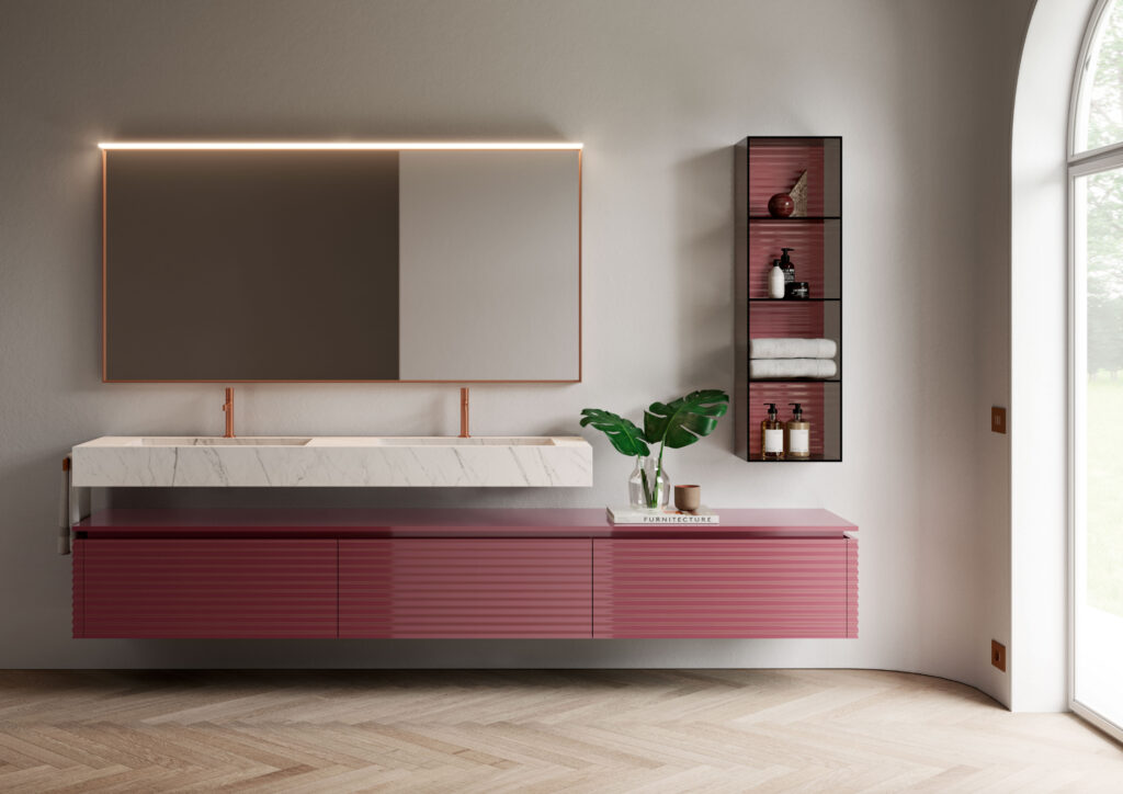 Partiamo dai legni: al rovere moro e naturale si aggiungono infatti le varianti sbiancato, visone, fumo e mattone, per un totale di sei varianti d’essenza capaci di donare calore ed eleganza alle composizioni d’arredo bagno. Un’ulteriore novità apportata alla gamma è la possibilità di optare per la finitura laccata lucida per tutte le basi della collezione: i colori si fanno dunque accesi e luminosi, ampliando le capacità espressive di Dolcevita.