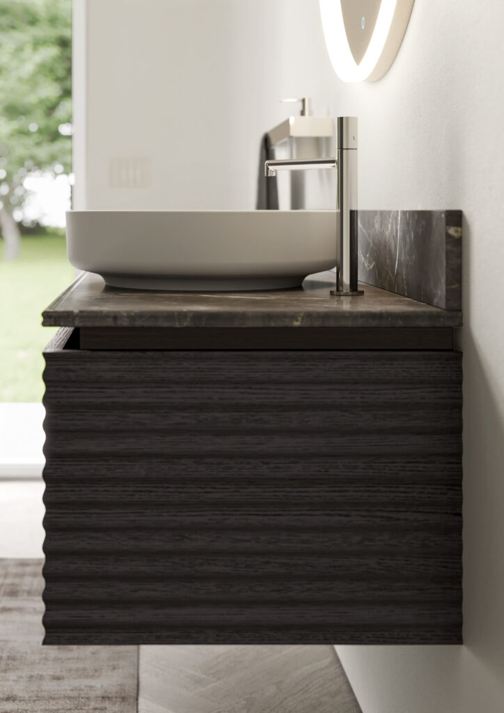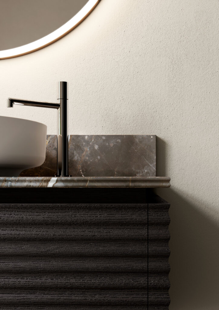 Alle novità relative alle colorazioni e finiture di frontali e scocca si aggiunge quella introdotta per il top in marmo, il cui bordo – sp. 2 cm – può essere lavorato con una doppia fresata che crea sia un’onda esteticamente gradevole (oltre che coordinata con il movimento tipico di Dolcevita) sia un pratico rilievo salvagoccia.