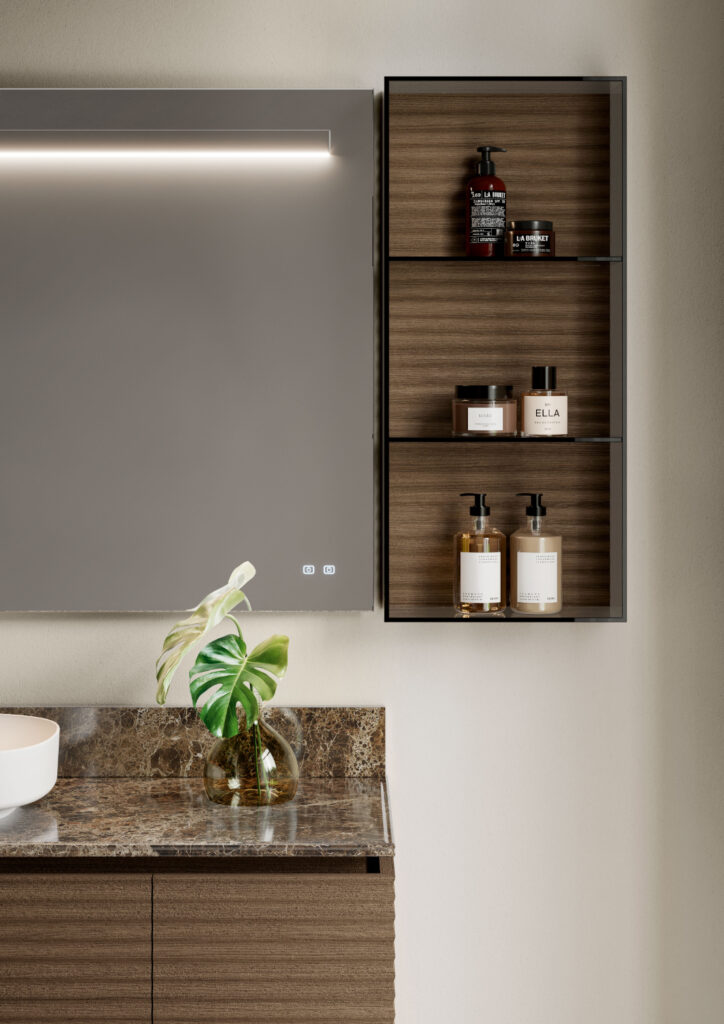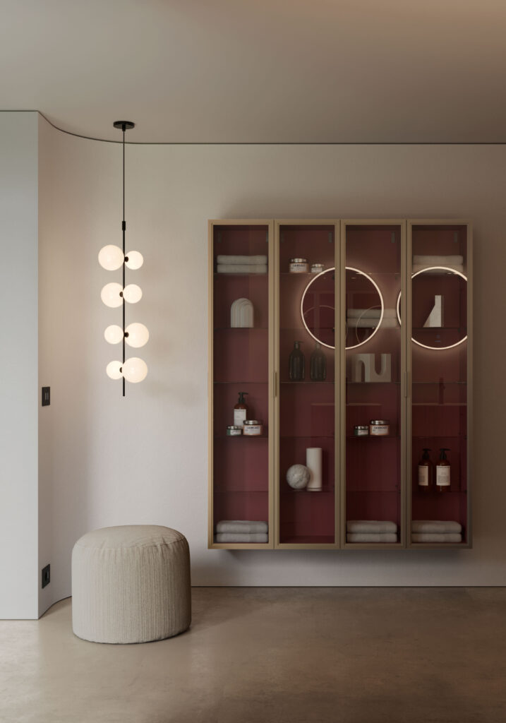 Sempre in finitura fumè le ante vetrate dei nuovi contenitori sospesi con telaio in finitura bronzo e maniglia integrata, ulteriore novità di Dolcevita. Colonne e pensili di diversa profondità e altezza per dar vita a composizioni movimentate e originali in perfetto coordinamento stilistico.