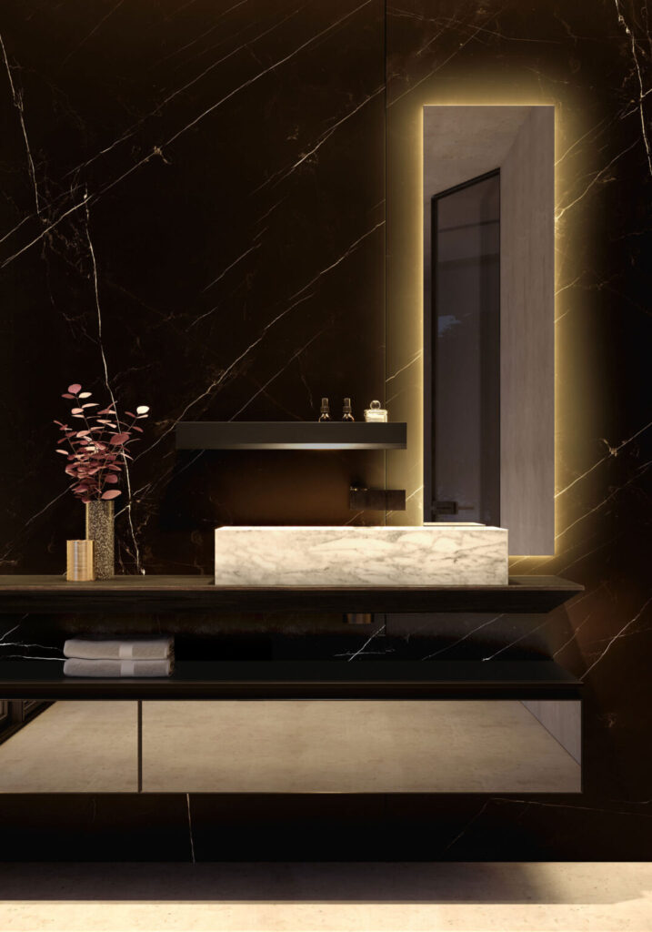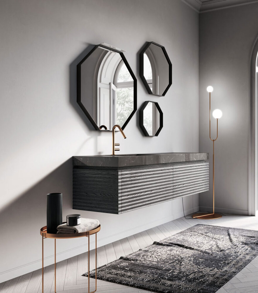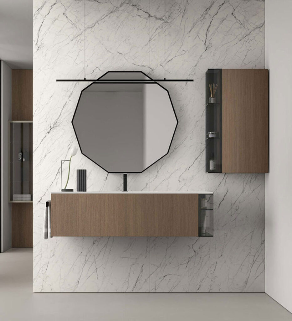 Partiamo da quella più comune: la classica specchiera rettangolare lineare, con cornice metallica sottile. Sebbene spesso si scelga una specchiera della stessa lunghezza del mobile, non si tratta di una regola fissa – anzi. Le misure in questo caso sono numerose, si può giocare con l’installazione in orizzontale o verticale, affiancando la specchiera a pensili o mensole, a seconda delle esigenze di progetto. L’illuminazione può essere integrata nella cornice, creando giochi di luce diffusa che enfatizzano i volumi e il design dell’arredamento.