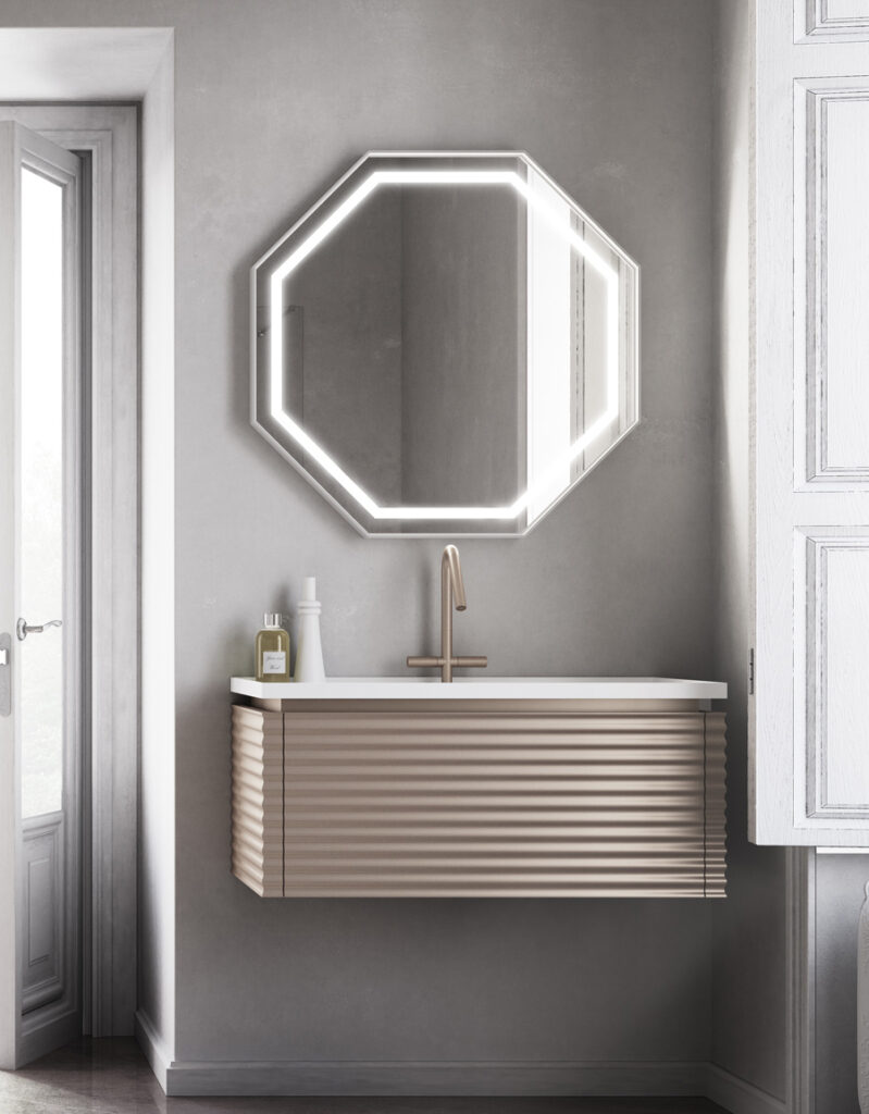 Una scelta stilistica precisa e d’impatto: lo specchio decorativo è un’alternativa a quello tondo con un’impronta un po’ più decisa e un accento lievemente retró. Si inserisce quindi sia in contesti contemporanei che in bagni con uno stile d’arredamento tradizionale o vintage. Elegantissimo e insolito, può fare da protagonista della composizione d’arredo, e può essere per esempio ottagonale o decagonale.