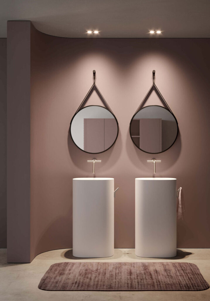 Lo specchio da bagno tondo interrompe le linee squadrate dell’ambiente e (spesso) dell’arredamento e crea un movimento differente rispetto alla versione rettangolare. A seconda del diametro può avere un impatto stilistico diverso: si possono usare più specchiere di diametro diverso o una sola maxi specchiera. La presenza di una cornice può inoltre contribuire a sottolineare il coordinamento materico con gli altri elementi.