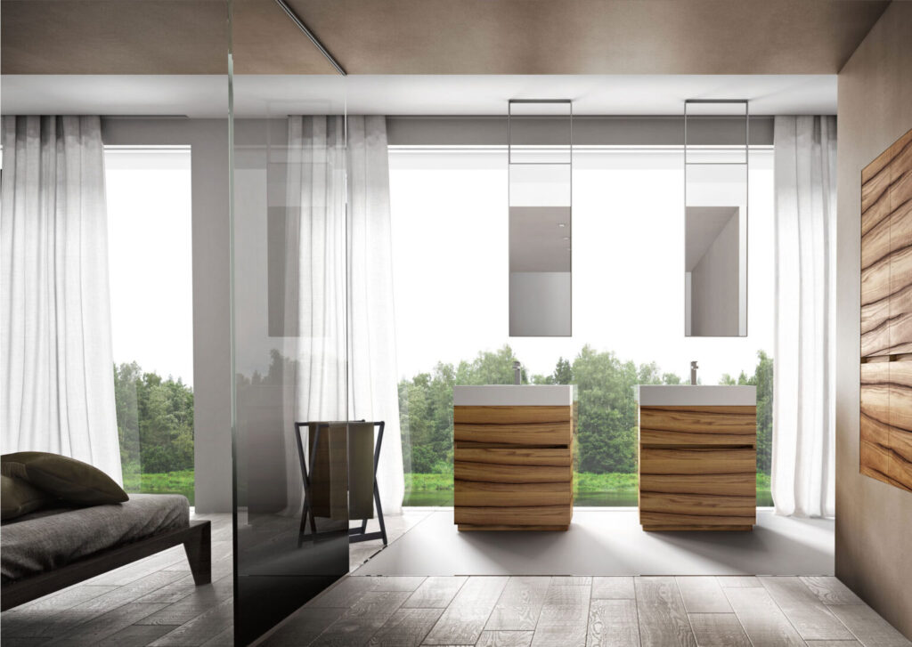 Come fare se il mobile da bagno (o il lavabo) è freestanding, ovvero installato a centro stanza o lontano dalla parete? Niente paura, la specchiera si installa sospesa, fissandola al soffitto! In questo caso si tratta di specchi bifacciali che contribuiscono anche a riflettere maggiore quantità di luce sia da un lato che dall’altro. Il posizionamento non è necessariamente centrato rispetto al mobile: sperimentare e giocare anche con disallineamenti può dare un carattere del tutto insolito alla stanza da bagno!