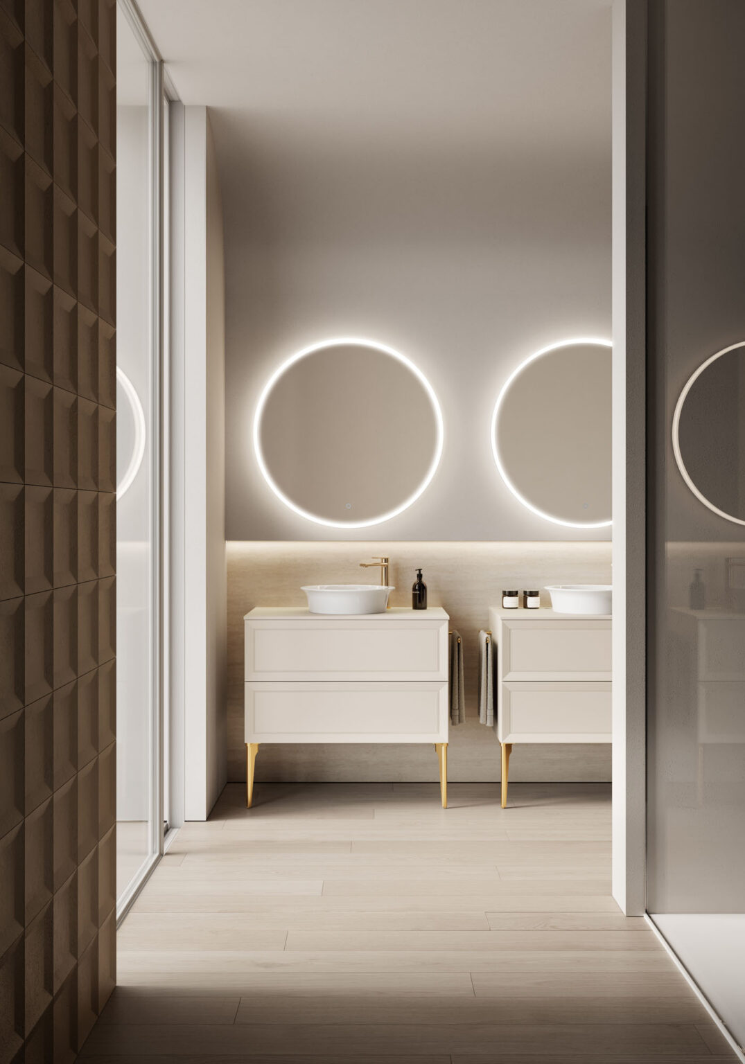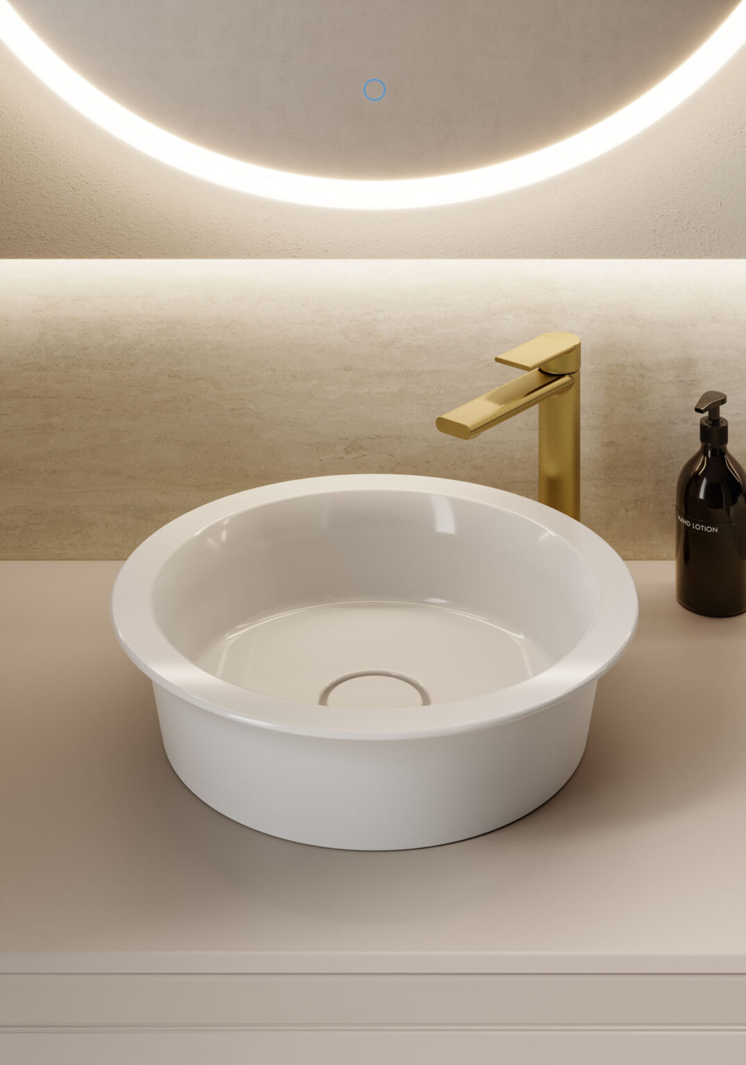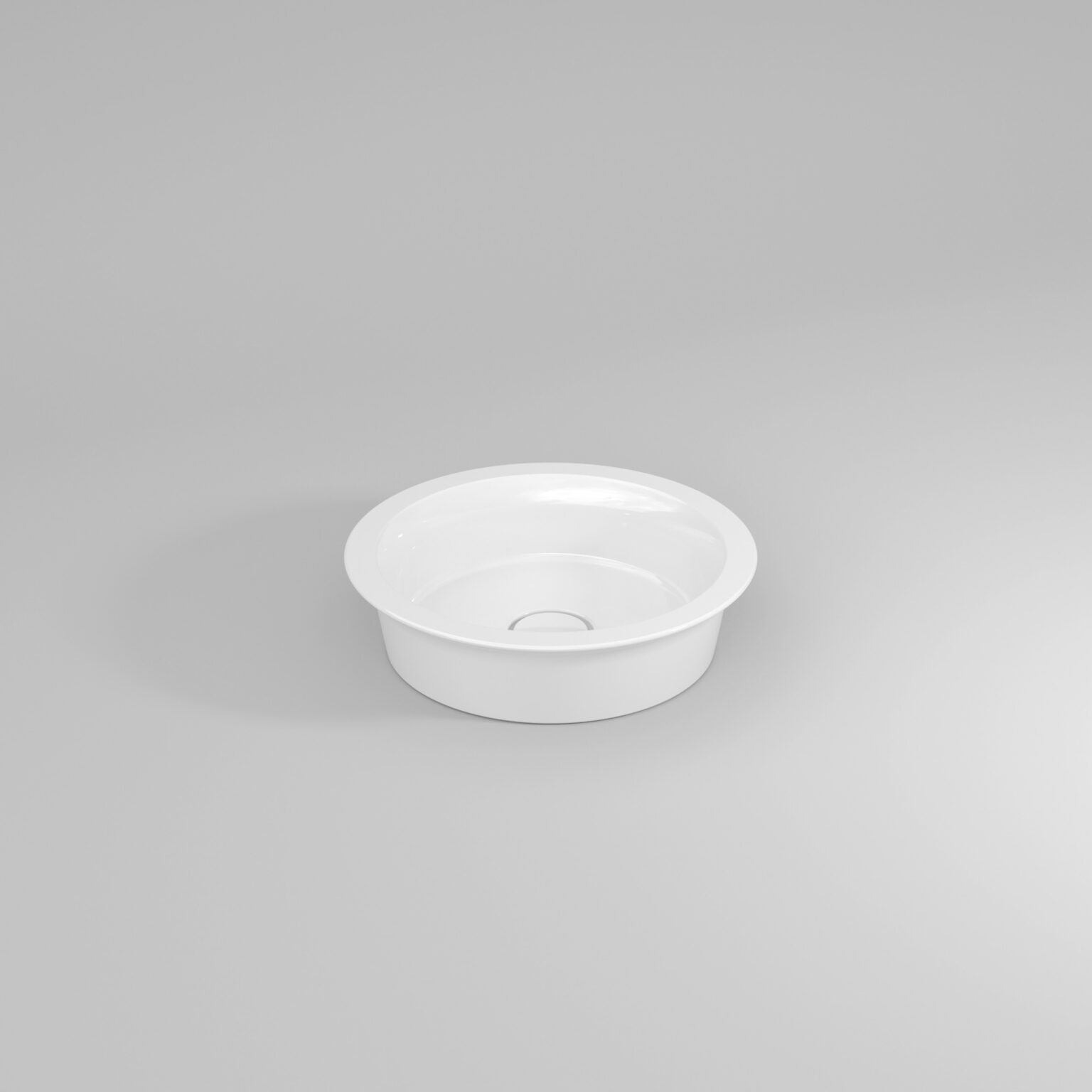 Lavabo Berlino Tondo soprapiano da appoggio, in ceramica bianco lucido, senza troppopieno. Disponibile per top lineari con profondità 45.5 cm.