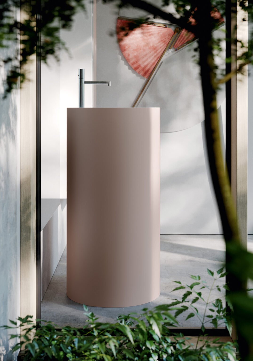 Lavabo Cilindro freestanding in Cristalplant® bianco opaco, colorato esternamente o colorato totale nei colori opachi e Metal Color Ideagroup (colori Metal solo esterno). Con foro rubinetto (a richiesta senza) e con troppopieno.