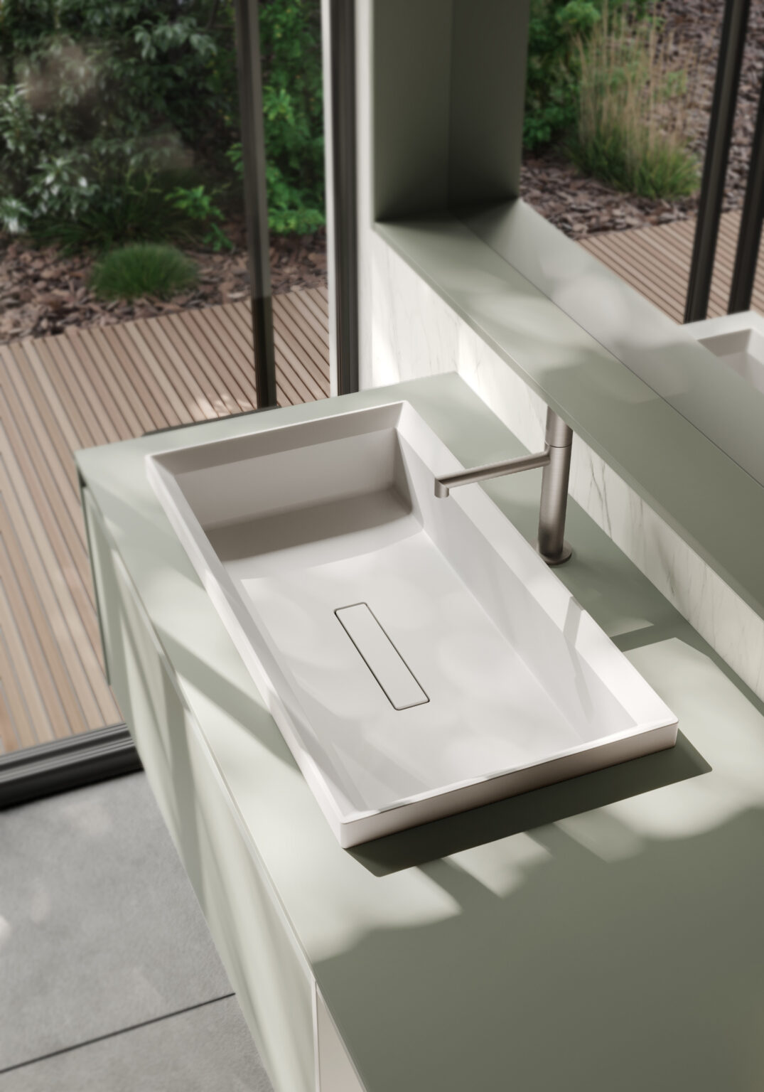 Lavabo Elite incasso soprapiano in Mineralux e Mineralsolid, bianco e nei colori Ideagroup (no Metal Color). Senza troppopieno. Disponibile per top con profondità 45.5 cm.