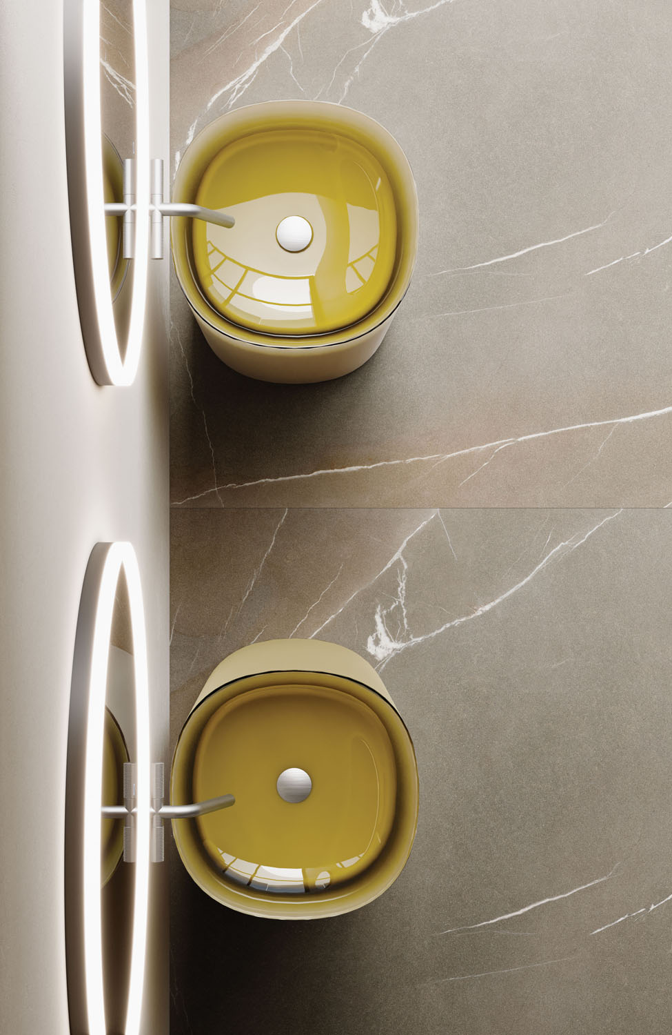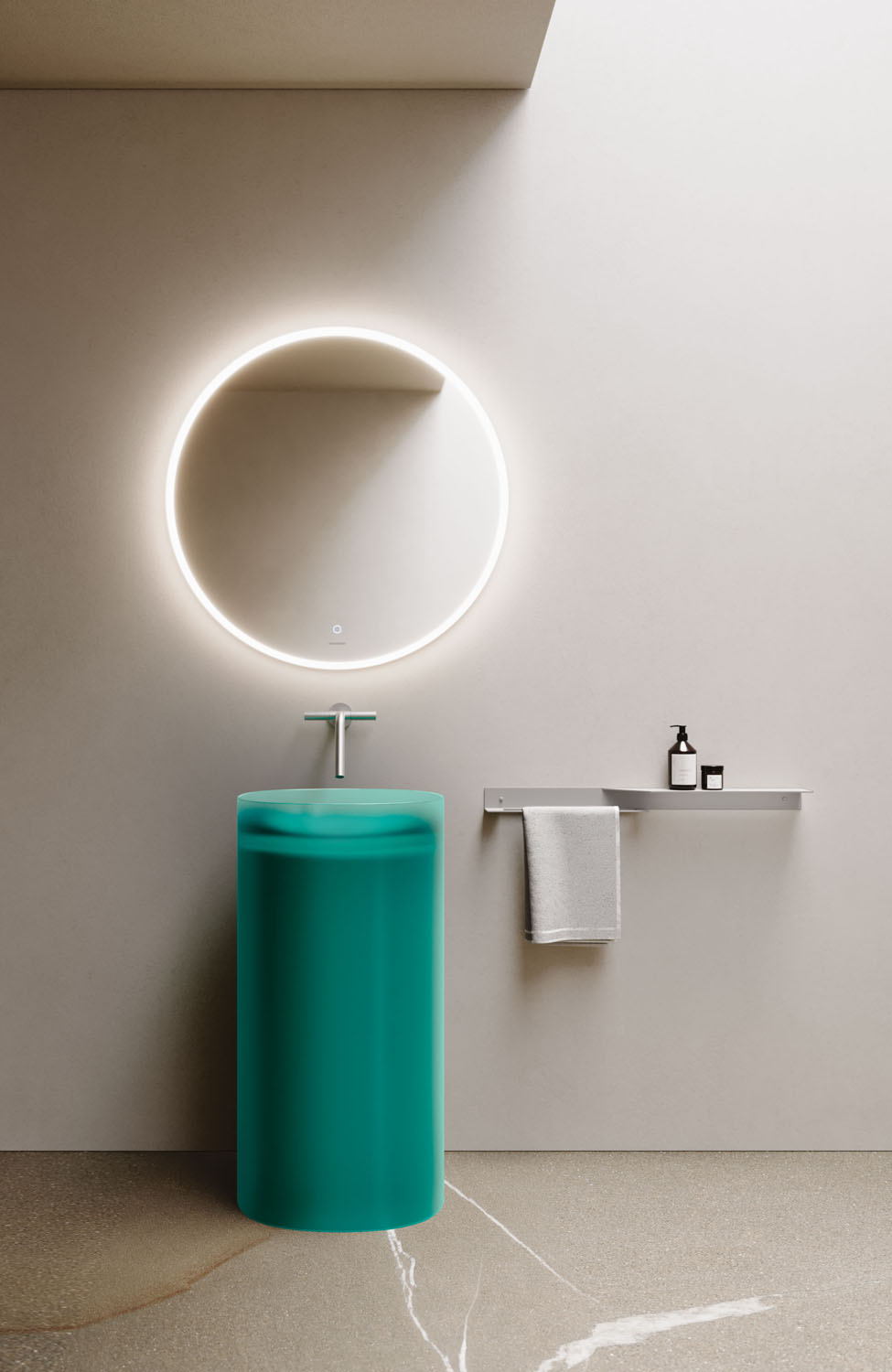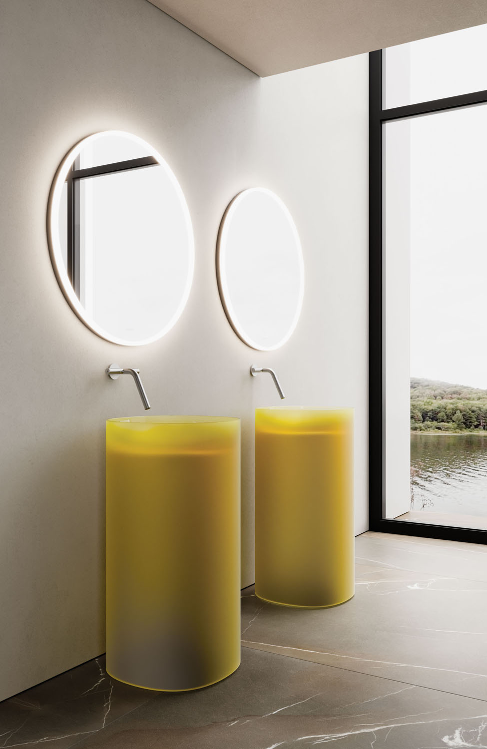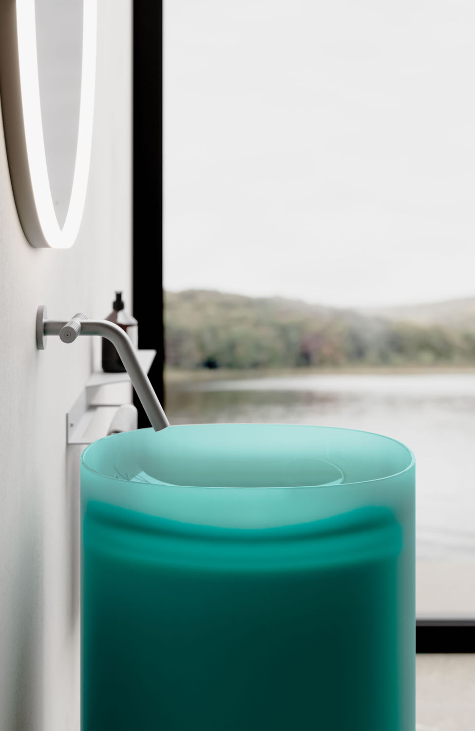 Lavabo freestanding Habe in Khromalite, in finitura esterno ed interno lucida o solo esternamente satinata, disponibile in 5 cromie; senza troppopieno.