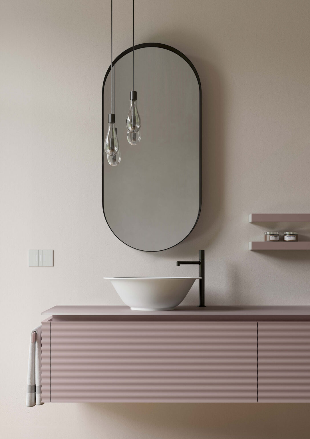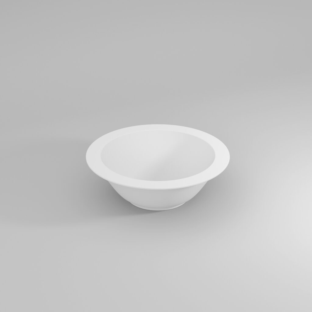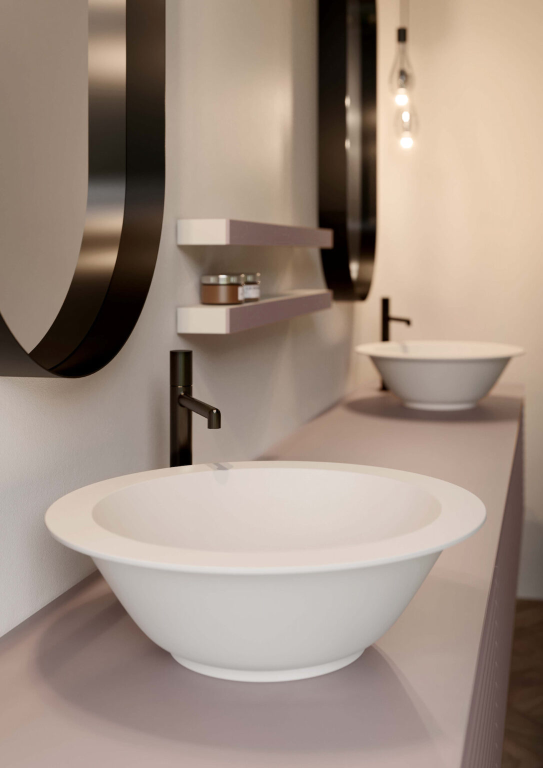 Lavabo Marea soprapiano da appoggio in ceramica bianco lucido e bianco opaco, senza troppopieno e completo di piletta sempre aperta in finitura. Disponibile per top lineari con profondità 45,5 cm.