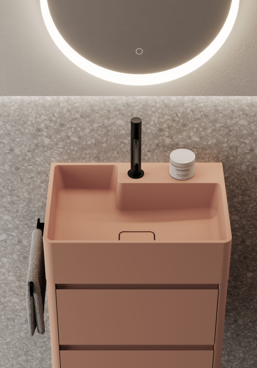 Aquatek è un materiale con effetto opaco e liscio composto da circa 2/3 di minerale naturale e 1/3 da resina acrilica di alta qualità. Omogeneo in tutto il suo spessore, non poroso, offre un’ottima resistenza agli urti, il suo colore si mantiene sostanzialmente immutato nel tempo ed è facilmente ripristinabile in caso di graffi e urti. Aquagel è un composito di cariche minerali naturali e resine polimeriche, rivestito da un film di resina che conferisce al prodotto un’assoluta impermeabilità, un’ottima resistenza agli agenti chimici, e una sensazione al tatto molto simile ai prodotti ceramici, ma con delle prestazioni e possibilità estetiche maggiori. È infatti disponibile sia in finitura lucida che opaca, nella variante bianco o nelle versioni colore del campionario Ideagroup (No nero e Metal Color). Questo materiale inoltre ha proprietà antibatteriche, ignifughe ed è autoestinguente.