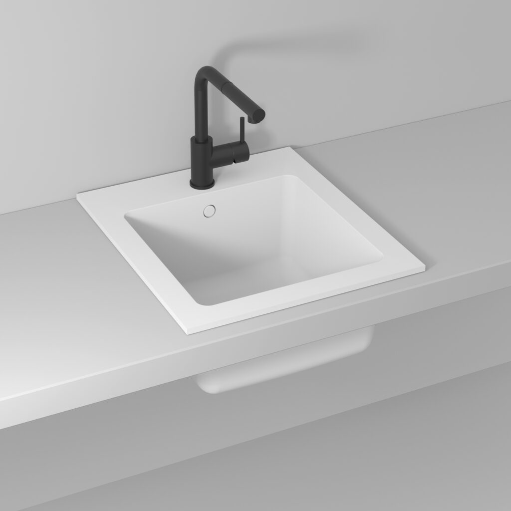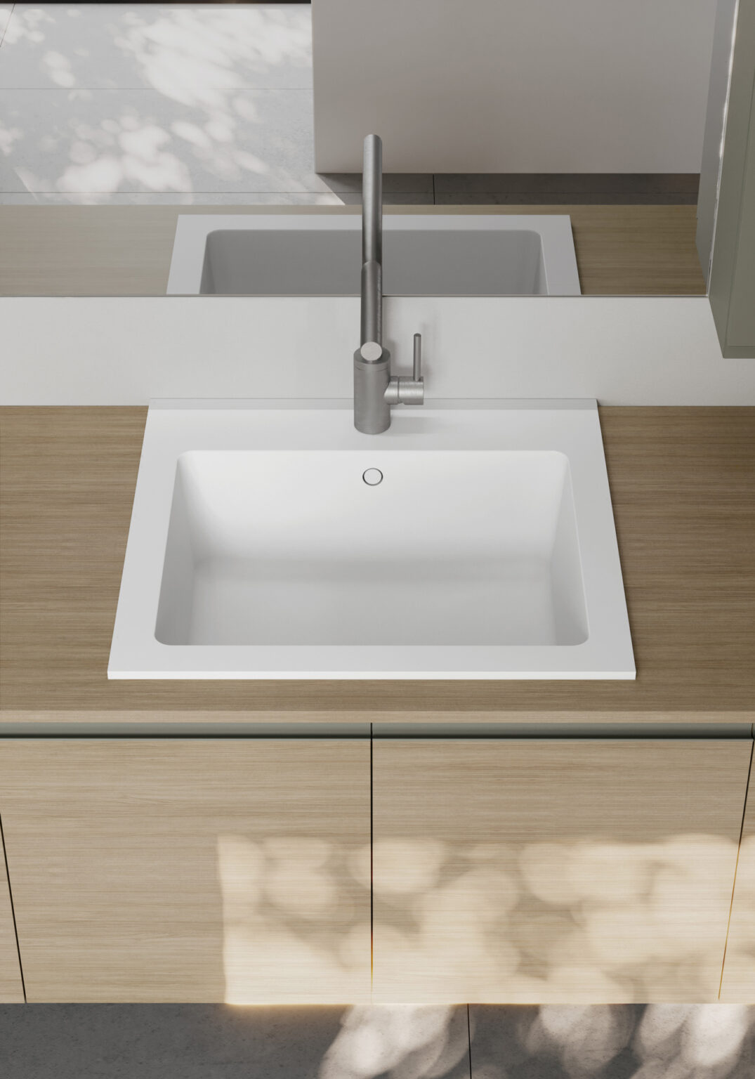 Lavatoio Tipo K in Acritek bianco lucido e opaco, con foro rubinetto (a richiesta senza), con troppopieno completo di tappo in finitura.