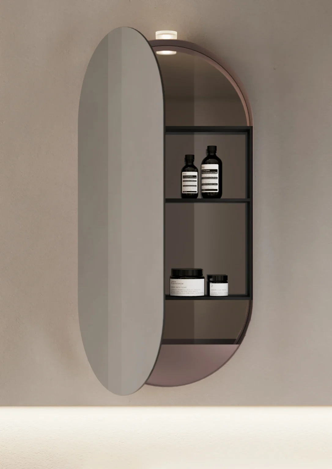 Specchiera contenitore Arena con struttura interna in alluminio nero, schienale a specchio e telaio esterno in metallo. Un’anta dx-sx e tre ripiani. Compatibile solo con lampada MUSE. IP44 – 3000 K o 4000 K W 6,4 – Lm 550 Optional: modulo con presa e modulo con presa ed interruttore. La presa viene posizionata sempre in basso a Dx.