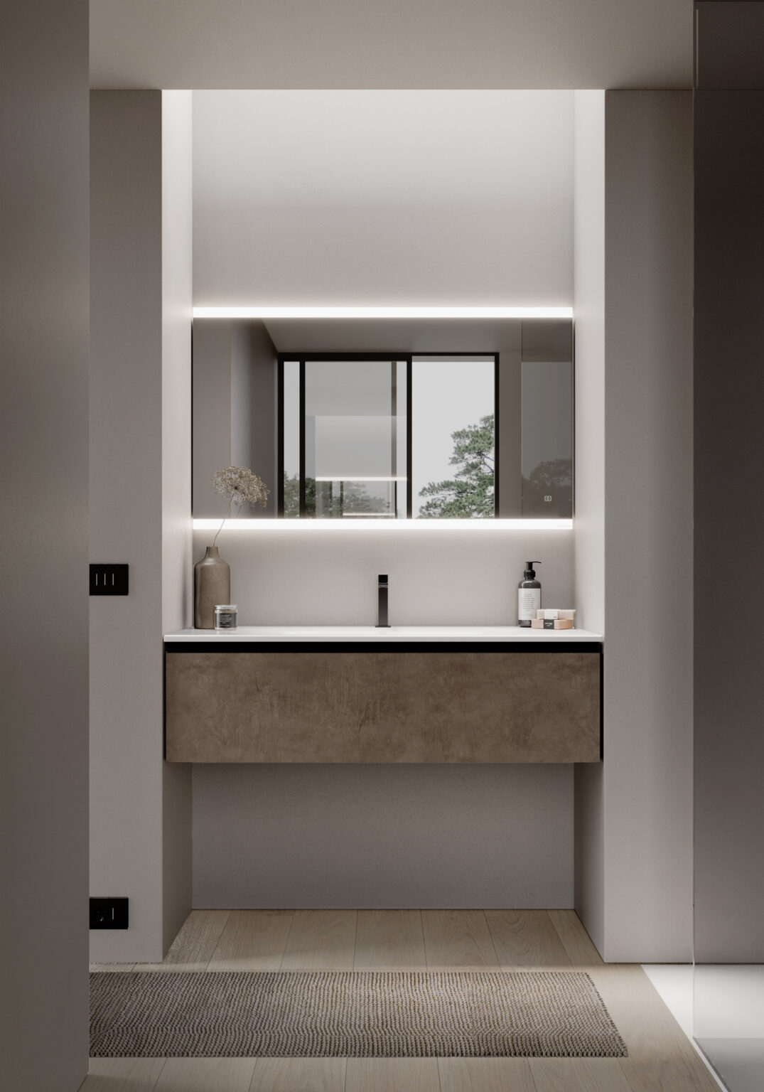Specchio Dual Touch con luce superiore e inferiore integrata a LED, con accensione Touch ON/OFF e luce cambio colore 2700/6000 K. Senza possibilità di presa e interruttore. IP44 – 4000 K. W da 13 a 35 – Lm da 830 a 2.160