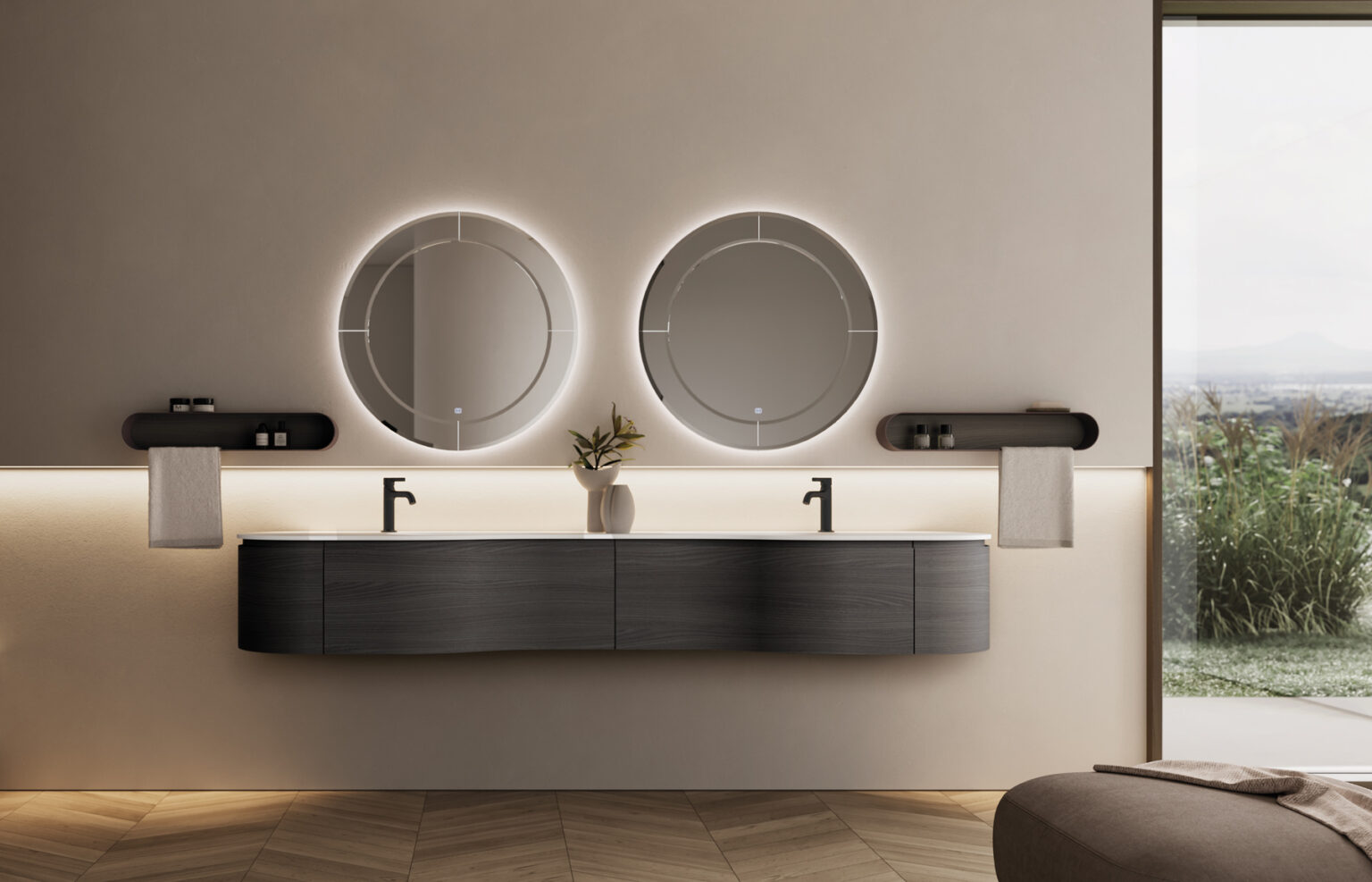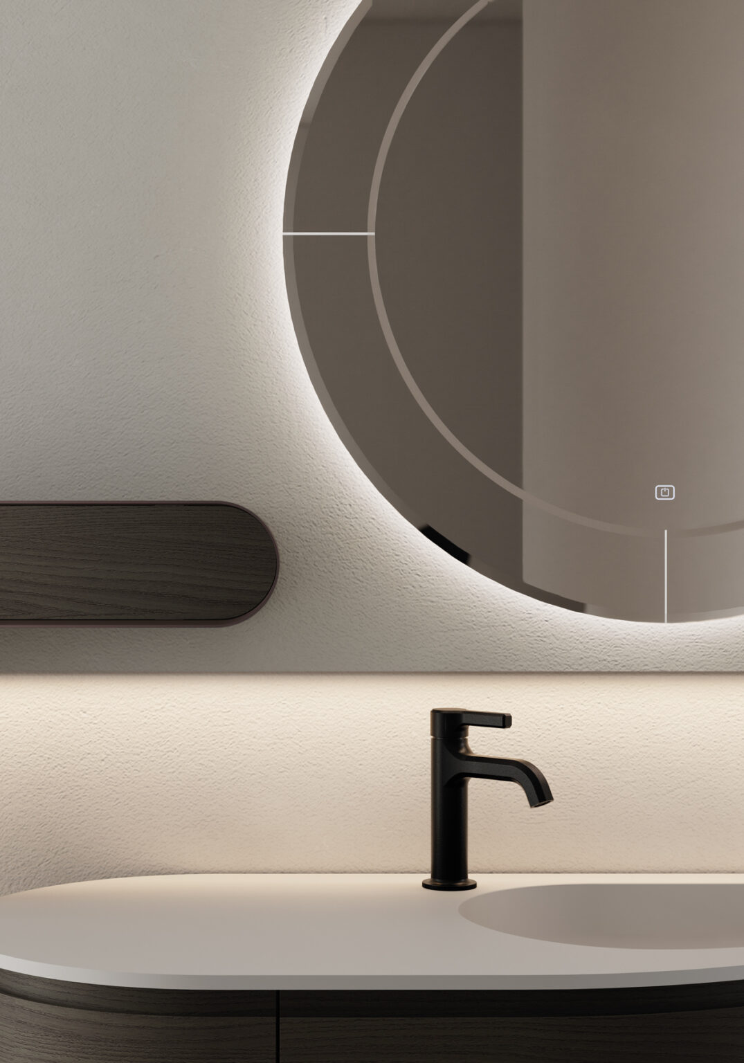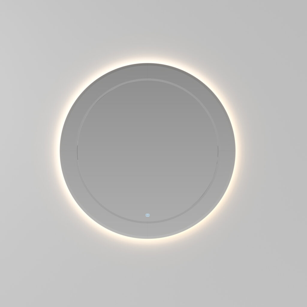 Specchio Marte con cornice perimetrale a specchio bisellato, retroilluminazione a LED con tastiera di accensione TOUCH ON/OFF e luce cambio colore 2700 K/6000 K. Non compatibile con altre lampade. IP44 W da 17 a 25 – Lm da 1.350 a 2.100