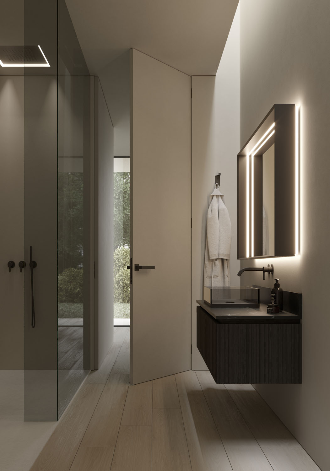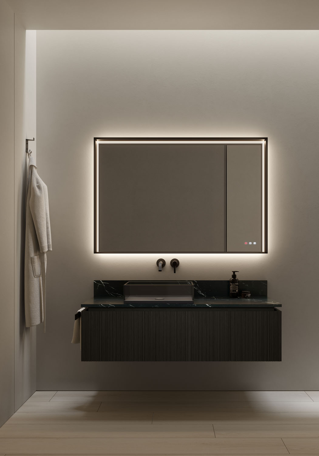 Specchio Pigreco retroilluminato con telaio in alluminio, illuminazione LED integrata 3 lati, antiappannamento, con accensione Touch ON/OFF e cambio colore 2700/4000 K. Senza possibilità di presa. IP44 W da 50 a 121 – Lm da 2.052 a 4.536
