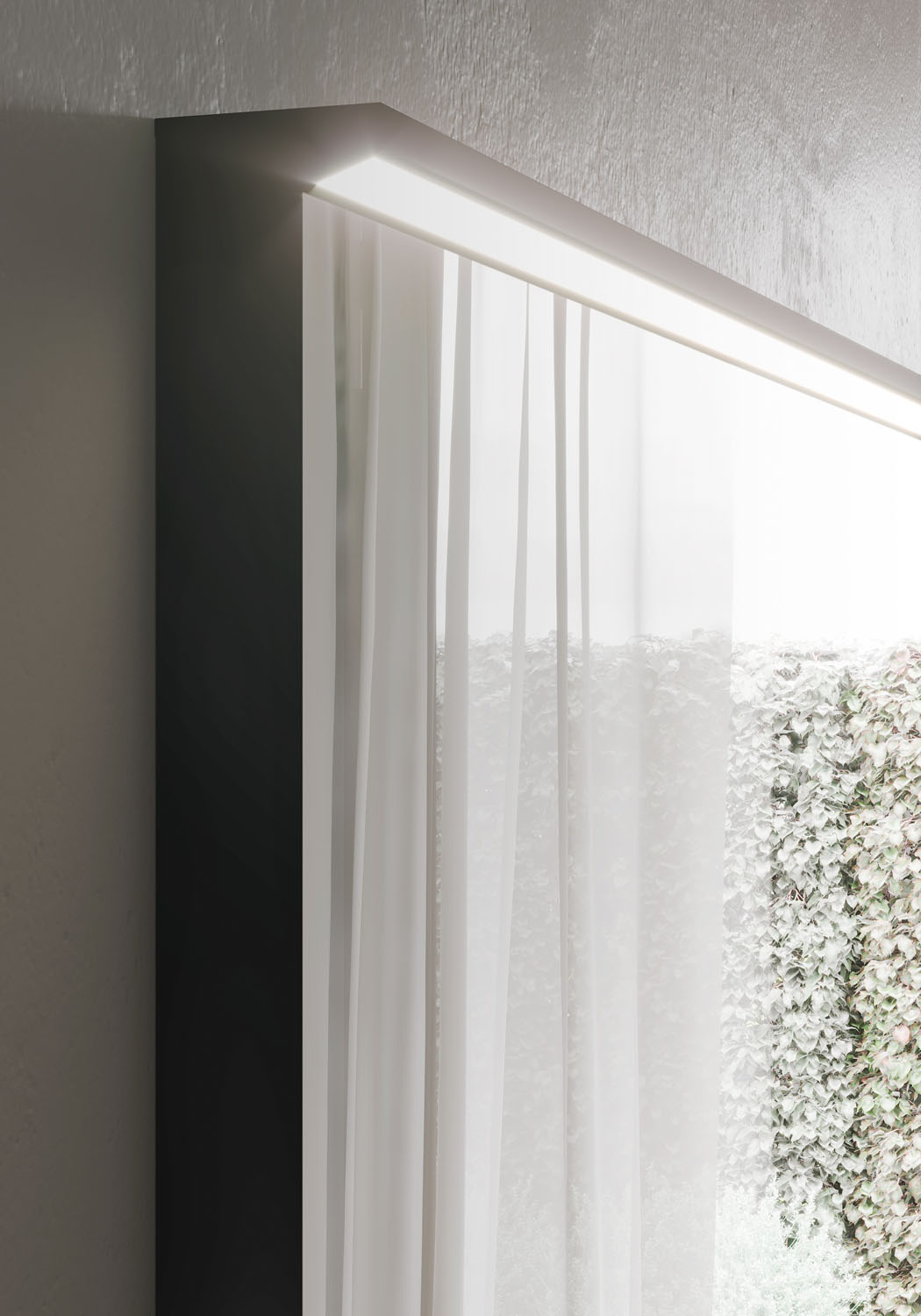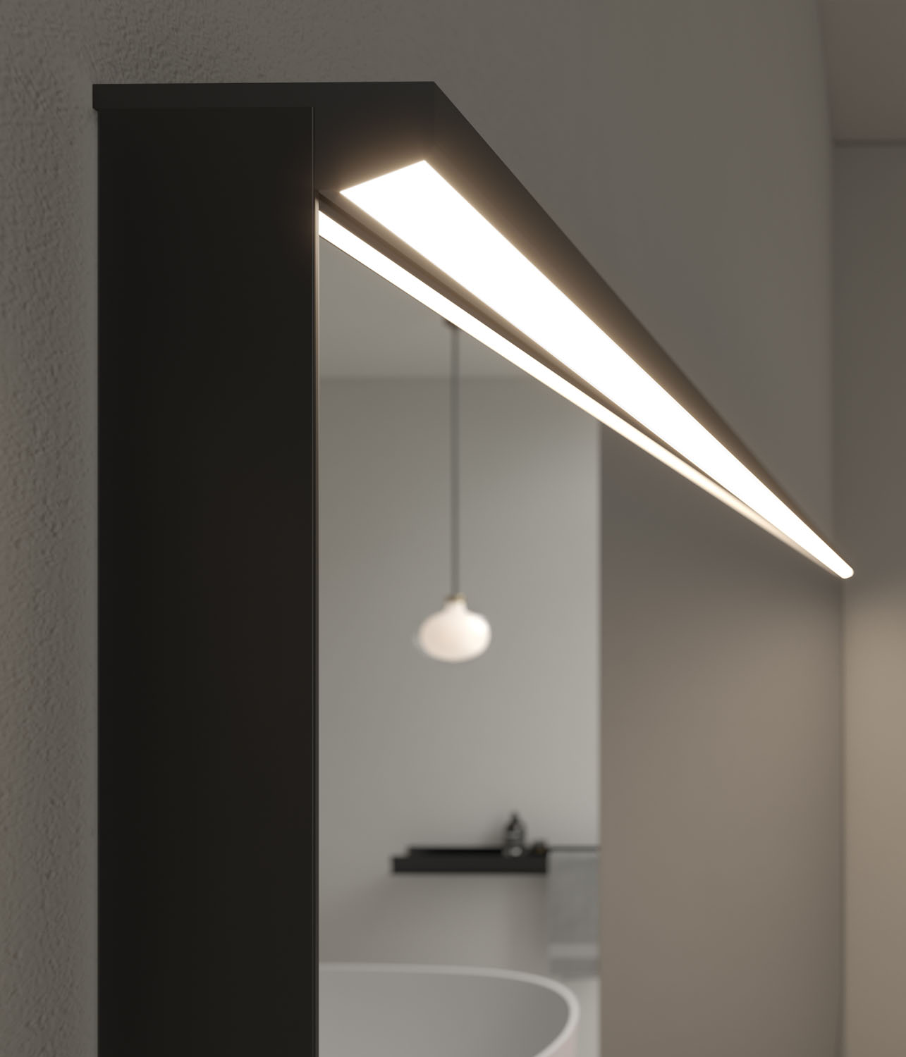 Specchiera con telaio in alluminio nero e luce led superiore integrata. IP44 – 3000 o 4000 K W da 6,5 a 14,6 – Lm da 900 a 2,025