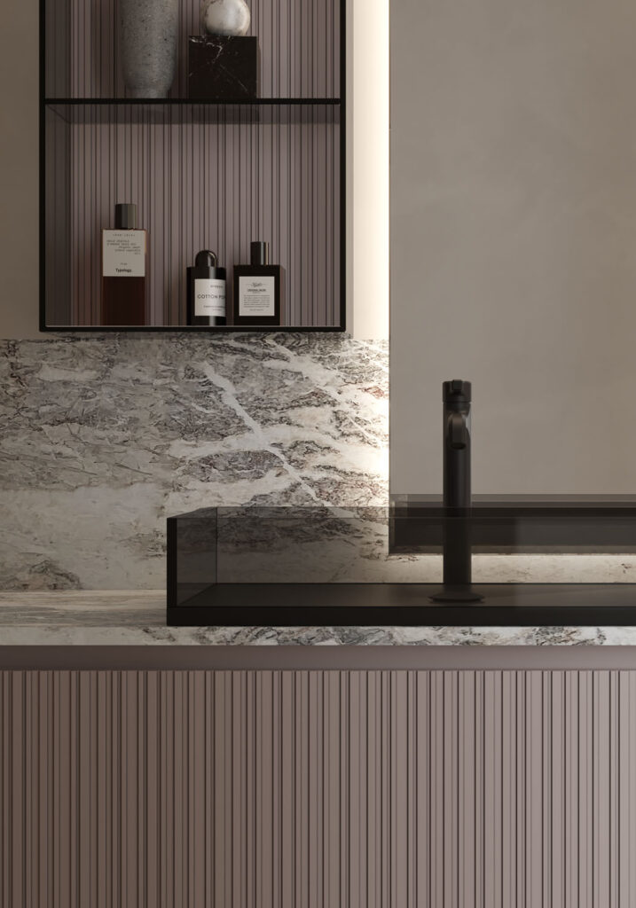 Nuovo lavabo rettangolare da appoggio in Cristallo lucido Fumé, con fondo vasca in Cristallo Nero opaco, disponibile in due dimensioni (L 50 e 65 cm) e abbinabile ai ripiani e ai vani a giorno nella medesima finitura.