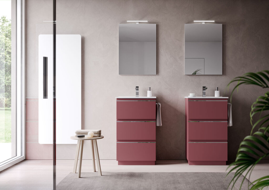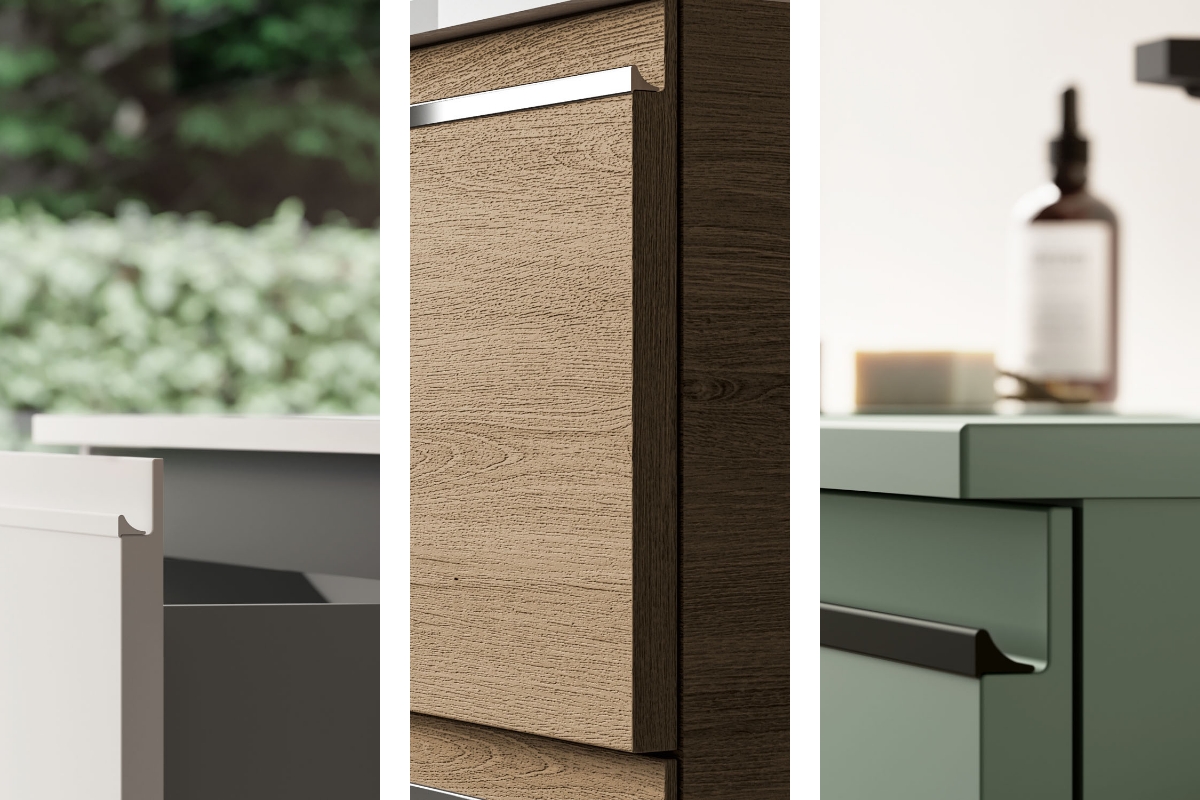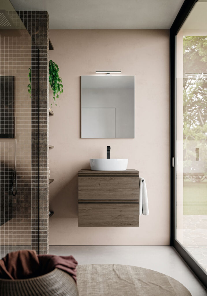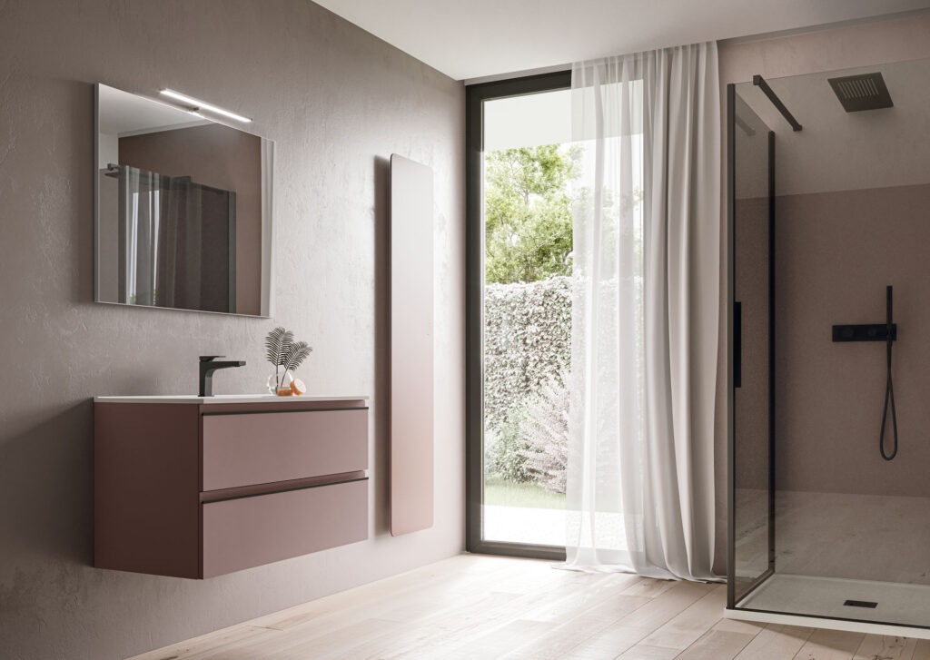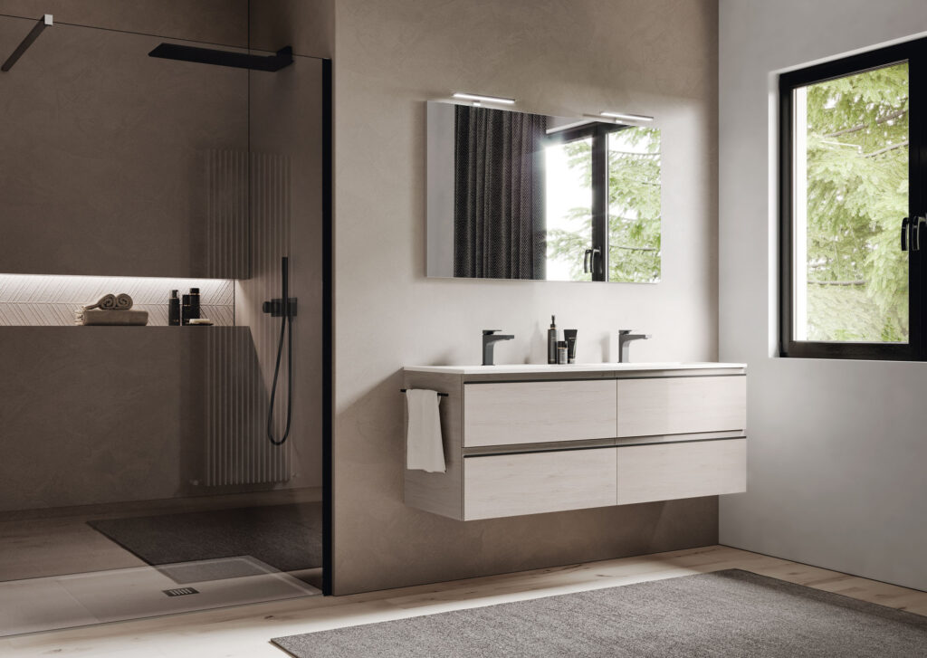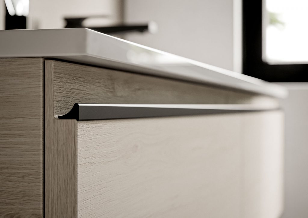 I mobili della collezione sono disponibili a terra o sospesi in un’ampia gamma di finiture e combinabili con diverse proposte di lavabo (in appoggio o integrato), una profondità ridotta (fino a 38,5 cm) per rispondere ad esigenze legate alla gestione dello spazio e maniglia presa gola declinabile in tre finiture (bianco, nero opaco, cromo) per una proposta coordinata.