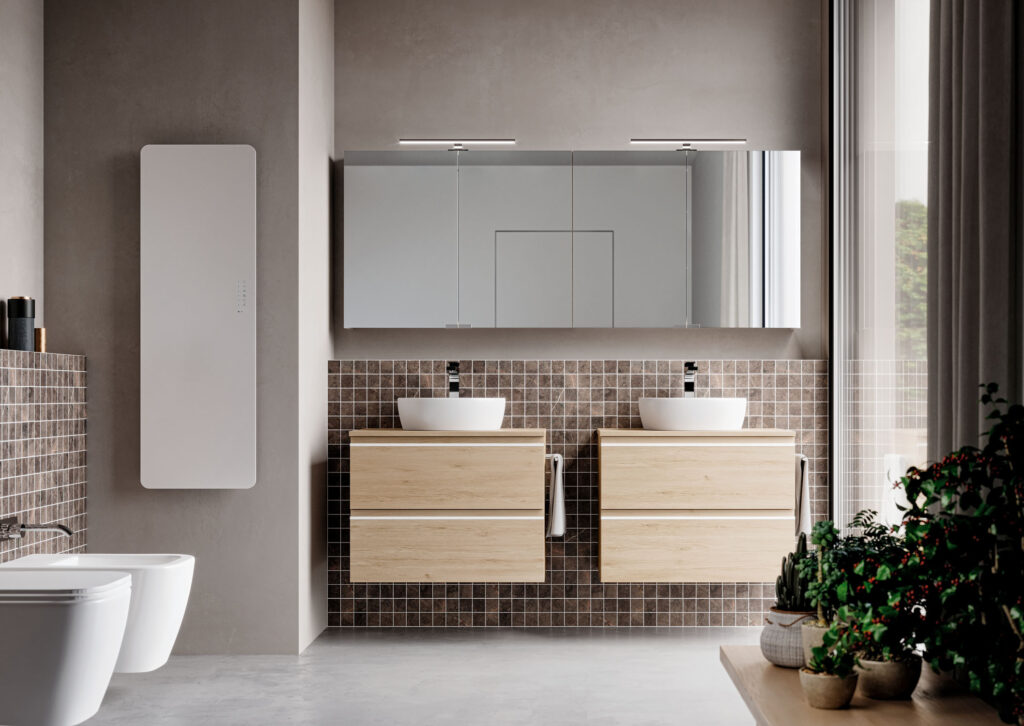 System è un programma caratterizzato da mobili da bagno salvaspazio con un’ottima capacità contenitiva e dimensioni compatte (fino a 38,5 cm di profondità).