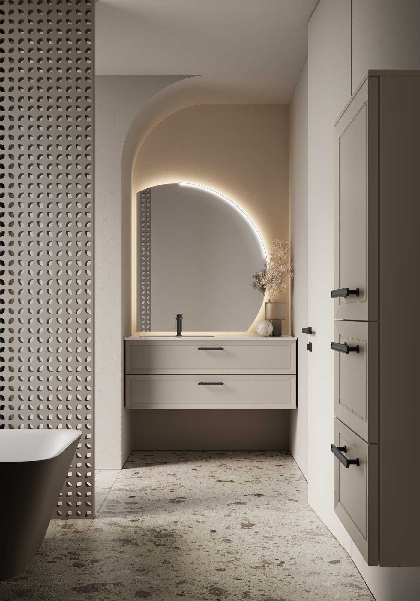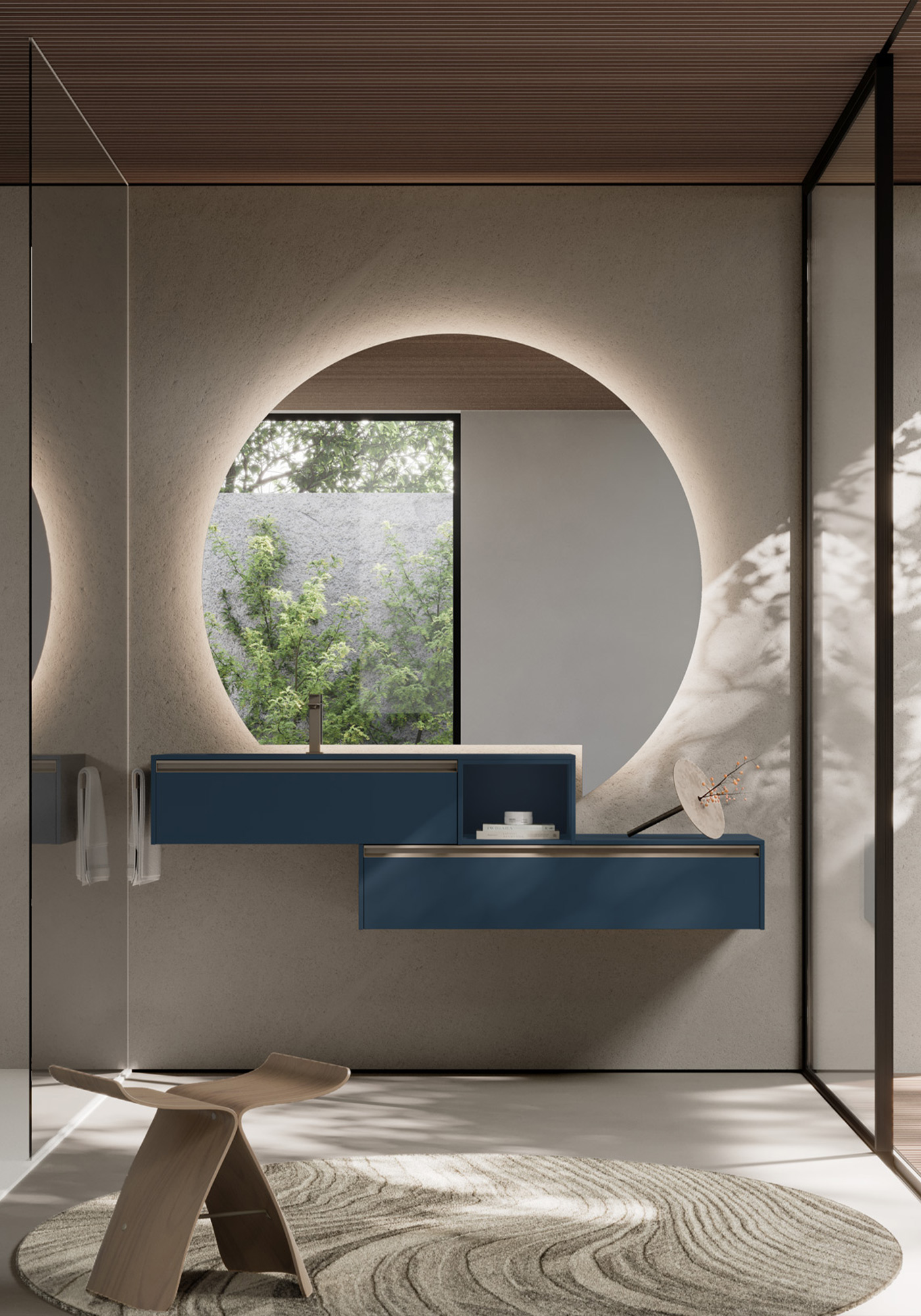 Geometrici, versatili ed eclettici i nuovi specchi Bijou, Ninfea, Platea e Lunetta con la loro forma morbida o asimmetrica, diventano il punto focale dell’arredo bagno. Abbinati alla lampada Arko o Piuma, diffondono una luce delicata che avvolge l’ambiente e ne valorizza materiali e proporzioni.